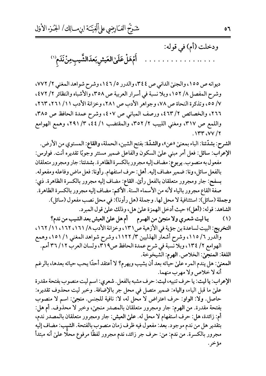الإعراب: ياليت: يا حرف تنبيه، ليت: حرف مشبه بالفعل. شعري: اسم ليت منصوب بفتحة مقدرة على ما قبل الياء، والياء: ضمير متصل في محلّ جر بالإضافة. وخبر ليت محذوف تقديره: حاصل. ولا: الواو: حرف اعتراض لا محلّ له،: نافية للجنس. منجى: اسم لا منصوب بفتحة مقدرة. من الهرم: جار ومجرور متعلقان بالمصدر منجى، وخبر لا محذوف. أم هل: أم: زائدة، هل: حرف استفهام لا محلّ له. على العيش: جار ومجرور متعلقان بالمصدر ندم، بتقدير هل من ندم موجود. بعد: مفعول فيه ظرف زمان منصوب بالفتحة. الشيب: مضاف إليه مجرور بالكسرة. من ندم: من: حرف جر زائد، ندم مجرور لفظًا مرفوع محلًّا على أنه مبتدأ مؤخر.