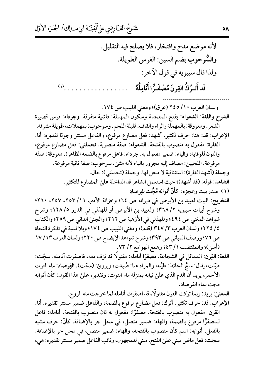 اللغة: القِرن: المماثل في الشجاعة. مصفرًا أنامله: مقتولًا قد نزف دمه، فاصفرت أنامله. سجّت: طيّنت، يقال: سجَّ الحائط: طيَّنه، والمراد هنا: صُبغت، ويروى: (مجّت). الفِرصاد: ماء التوت الأحمر، يريد أن الدم الذي على ثيابه بمنزلة ماء التوت، وتقديره على هذا القول: كأن أثوابه مجت بماء الفرصاد.