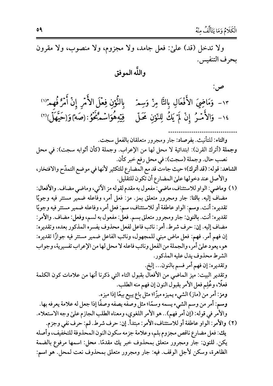 (¬١) وماضي: الواو للاستئناف، ماضي: مفعول به مقدم لقوله مز الآتي، وماضي مضاف. والأفعال: مضاف إليه. بالتا: جار ومجرور متعلق بمز. مز: فعل أمر، وفاعله ضمير مستتر فيه وجوبًا تقديره: أنت. وسم: الواو عاطفة أو للاستئناف، سم: فعل أمر، وفاعله ضمير مستتر فيه وجوبًا تقديره: أنت. بالنون: جار ومجرور متعلق بسم. فعل: مفعول به لسم، وفعا: مضاف. والأمر: مضاف إليه. إن: حرف شرط. أمر: نائب فاعل لفعل محذوف يفسره المذكور بعده، وتقديره: إن فهم أمر. فهم: فعل ماض مبني للمجهول، ونائب الفاعل ضمير مستتر فيه جوازًا تقديره: هو، يعود على أمر، والجملة من الفعل ونائب فاعله لا محلّ لها من الإعراب تفسيرية، وجواب الشرط محذوف يدل عليه المذكور.