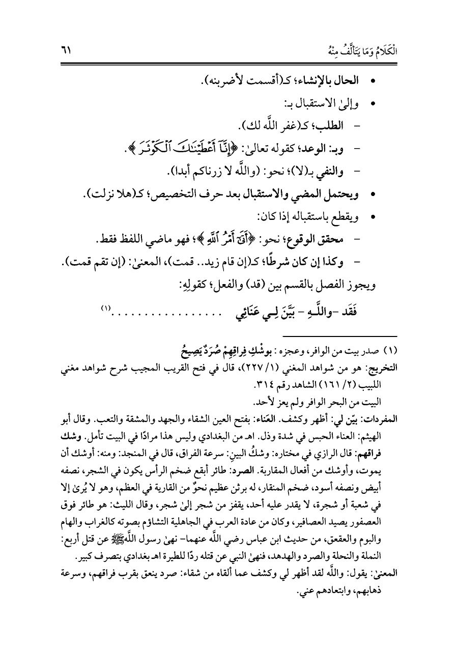 المفردات: بيّن لي: أظهر وكشف. العَناء: بفتح العين الشقاء والجهد والمشقة والتعب. وقال أبو الهيثم: العناء الحبس في شدة وذل. اهـ من البغدادي وليس هذا مرادًا في البيت تأمل. وشك فراقهم: قال الرازي في مختاره: وشكُ البينِ: سرعة الفراق، قال في المنجد: ومنه: أوشك أن يموت، وأوشك من أفعال المقاربة. الصرد: طائر أبقع ضخم الرأس يكون في الشجر، نصفه أبيض ونصفه أسود، ضخم المنقار، له برثن عظيم نحوٌ من القارية في العظم، وهو لا يُرى إلا في شعبة أو شجرة، لا يقدر عليه أحد، يقفز من شجر إلى شجر، وقال الليث: هو طائر فوق العصفور يصيد العصافير، وكان من عادة العرب في الجاهلية التشاؤم بصوته كالغراب والهام والبوم والعقعق، من حديث ابن عباس رضي اللَّه عنهما - نهى رسول اللَّه - صلى الله عليه وسلم - عن قتل أربع: النملة والنحلة والصرد والهدهد، فنهى النبي عن قتله ردًا للطيرة اهـ بغدادي بتصرف كبير.