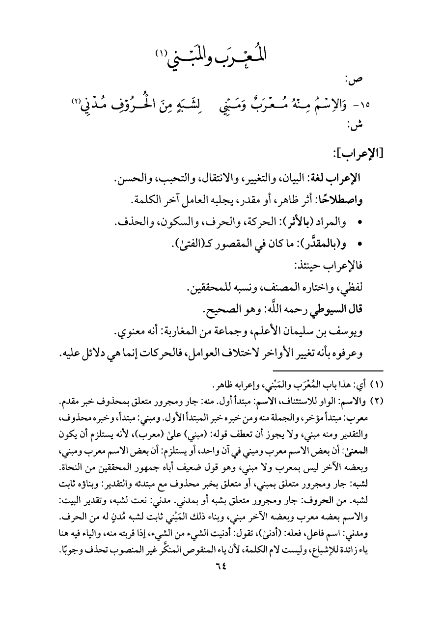 (¬٢) والاسم: الواو للاستئناف، الاسم: مبتدأ أول. منه: جار ومجرور متعلق بمحذوف خبر مقدم. معرب: مبتدأ مؤخر، والجملة منه ومن خبره خبر المبتدأ الأول. ومبني: مبتدأ، وخبره محذوف، والتقدير ومنه مبني، ولا يجوز أن تعطف قوله: (مبني) على (معرب)، لأنه يستلزم أن يكون المعنى؛ أن بعض الاسم معرب ومبني في آن واحد، أو يستلزم: أن بعض الاسم معرب ومبني، وبعضه الآخر ليس بمعرب ولا مبني، وهو قول ضعيف أباه جمهور المحققين من النحاة. لثبه: جار ومجرور متعلق بمبني، أو متعلق بخبر محذوف مع مبتدئه والتقدير: وبناؤه ثابت لشبه. من الحروف: جار ومجرور متعلق بشبه أو بمدني. مدني: نعت لشبه، وتقدير البيت: والاسم بعضه معرب وبعضه الآخر مبني، وبناء ذلك المَبْني ثابت لشبه مُدنٍ له من الحرف. ومدني: اسم فاعل، فعله: (أدنى)، تقول: أدنيت الشيء من الشيء، إذا قربته منه، والياء فيه هنا ياء زائدة للإشباع، وليست لام الكلمة، لأن ياء المنقوص المنكَّر غير المنصوب تحذف وجوبًا.