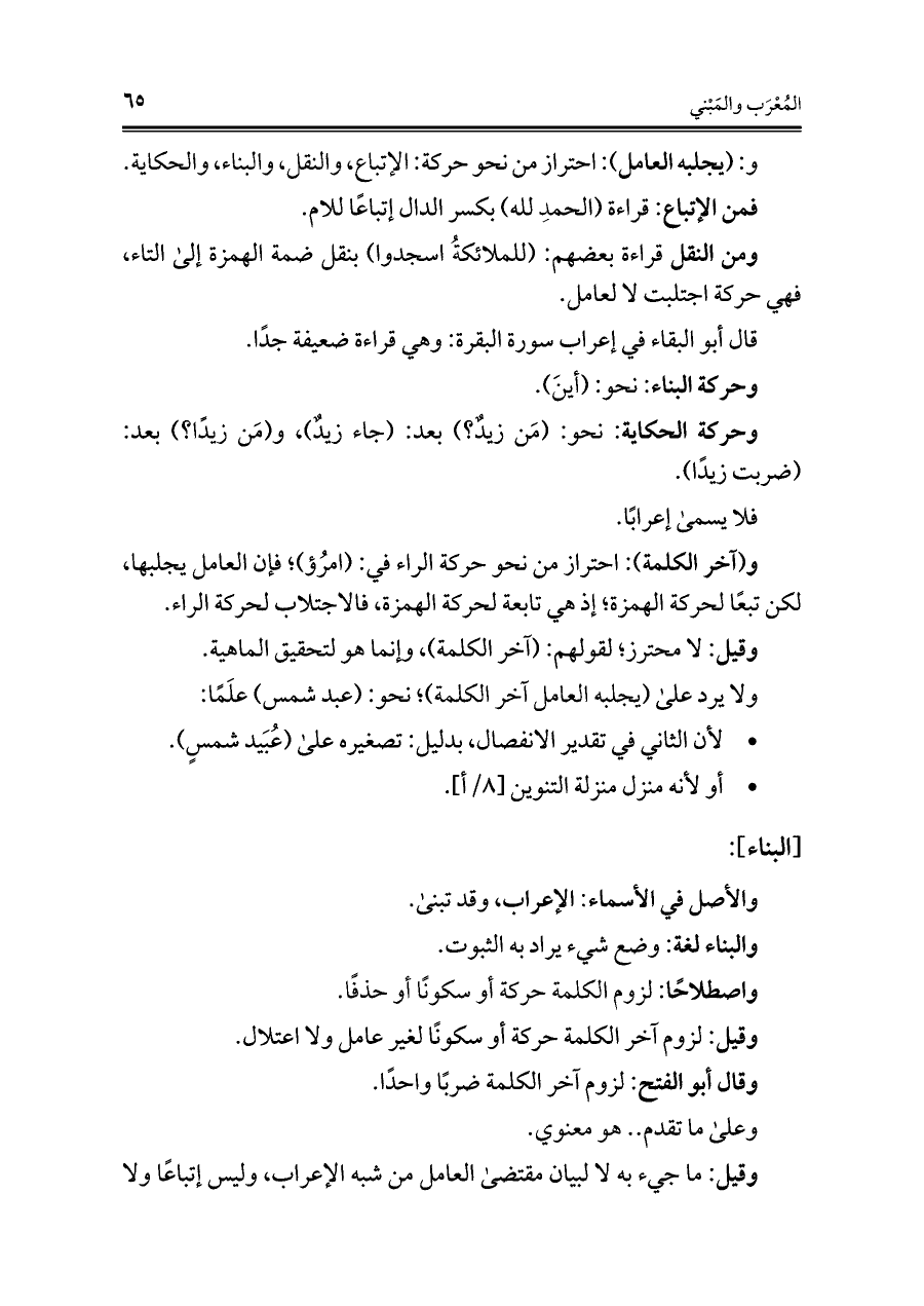وقيل: لزوم آخر الكلمة حركة أو سكونًا لغير عامل ولا اعتلال.