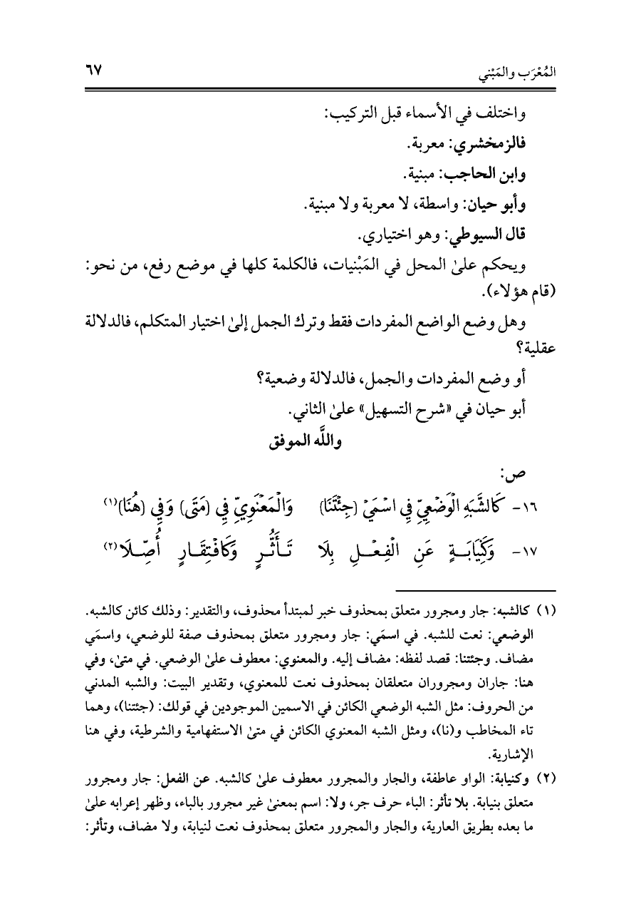 الوضعي: نعت للشبه. في اسمَي: جار ومجرور متعلق بمحذوف صفة للوضعي، واسمَي مضاف. وجئتنا: قصد لفظه: مضاف إليه. والمعنوي: معطوف على الوضعي. في متى، وفي هنا: جاران ومجروران متعلقان بمحذوف نعت للمعنوي، وتقدير البيت: والشبه المدني من الحروف: مثل الشبه الوضعي الكائن في الاسمين الموجودين في قولك: (جئتنا)، وهما تاء المخاطب و (نا)، ومثل الشبه المعنوي الكائن في متى الاستفهامية والشرطية، وفي هنا الإشارية.
