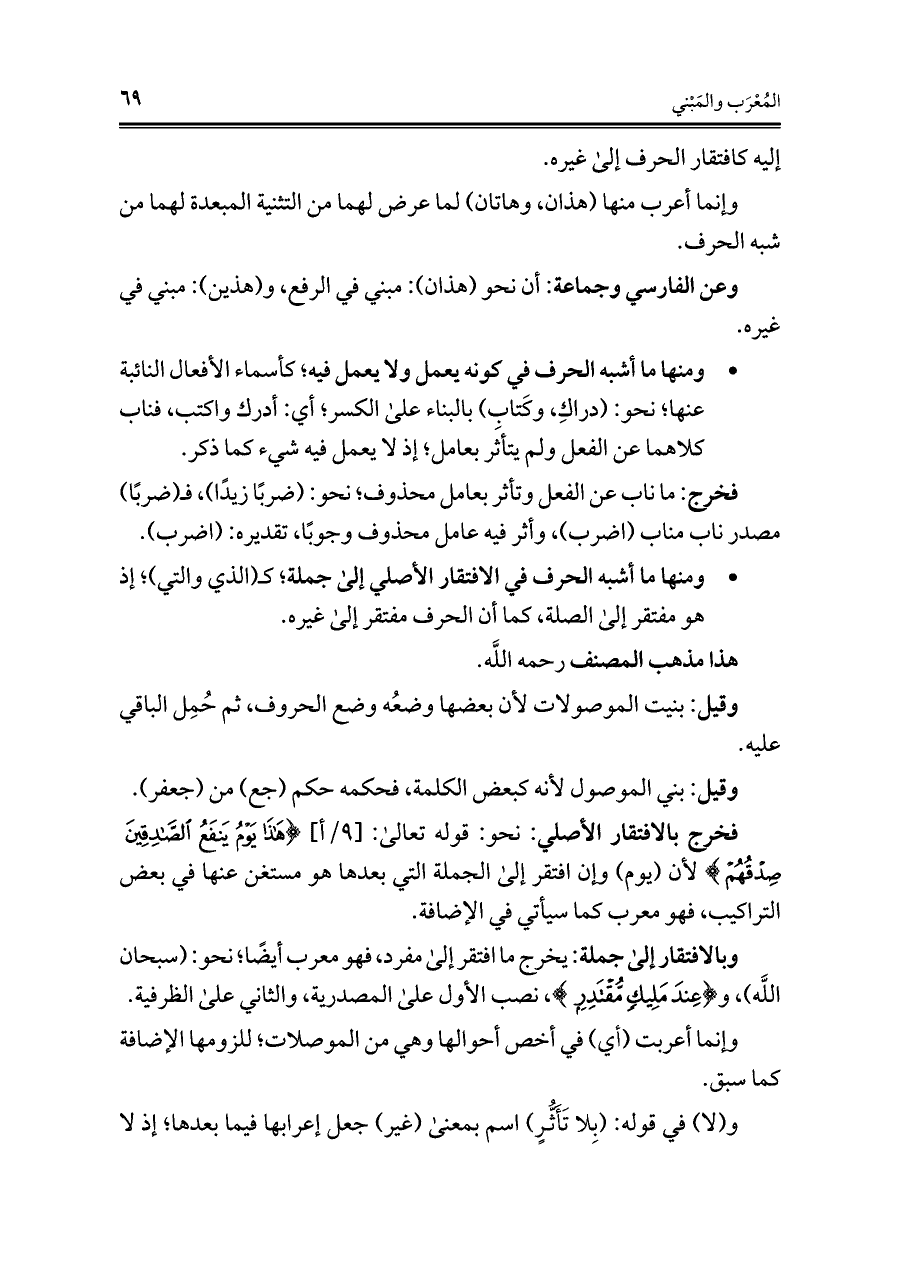 * ومنها ما أشبه الحرف في الافتقار الأصلي إلى جملة؛ كـ (الذي والتي)، إذ هو مفتقر إلى الصلة، كما أن الحرف مفتقر إلى غيره.