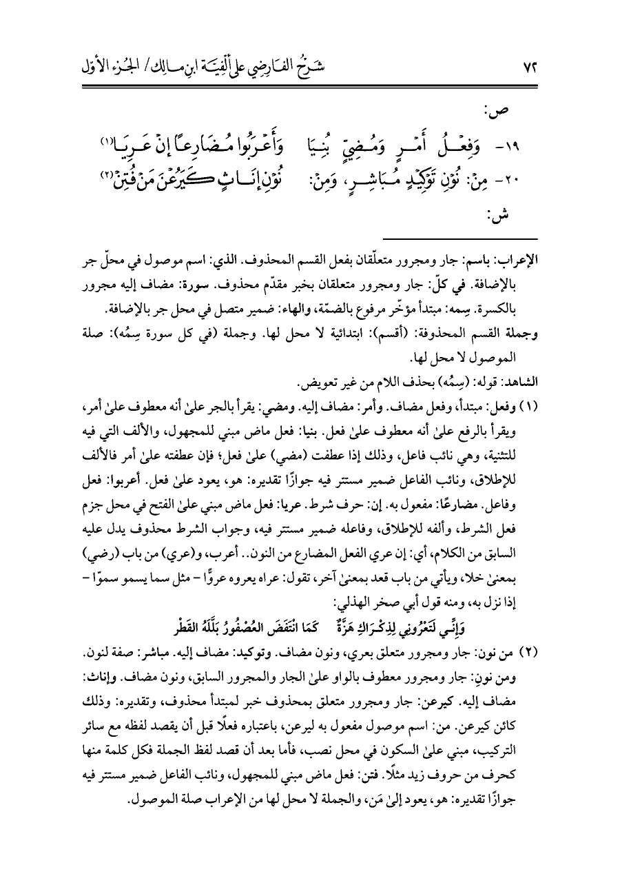 (¬١) وفعل: مبتدأ، وفعل مضاف. وأمر: مضاف إليه. ومضي: يقرأ بالجر على أنه معطوف على أمر، ويقرأ بالرفع على أنه معطوف على فعل. بنيا: فعل ماض مبني للمجهول، والألف التي فيه للتثنية، وهي نائب فاعل، وذلك إذا عطفت (مضي) على فعل؛ فإن عطفته على أمر فالألف للإطلاق، ونائب الفاعل ضمير مستتر فيه جوازًا تقديره: هو، يعود على فعل. أعربوا: فعل وفاعل. مضارعًا: مفعول به. إن: حرف شرط. عريا: فعل ماض مبني على الفتح في محلّ جزم فعل الشرط، وألفه للإطلاق، وفاعله ضمير مستتر فيه، وجواب الشرط محذوف يدل عليه السابق من الكلام, أي: إن عري الفعل المضارع من النون .. أعرب، و (عري) من باب (رضي) بمعنى خلا، ويأتي من باب قعد بمعنى آخر، تقول: عراه يعروه عروًّا -مثل سما يسمو سموّا- إذا نزل به، ومنه قول أبي صخر الهذلي: