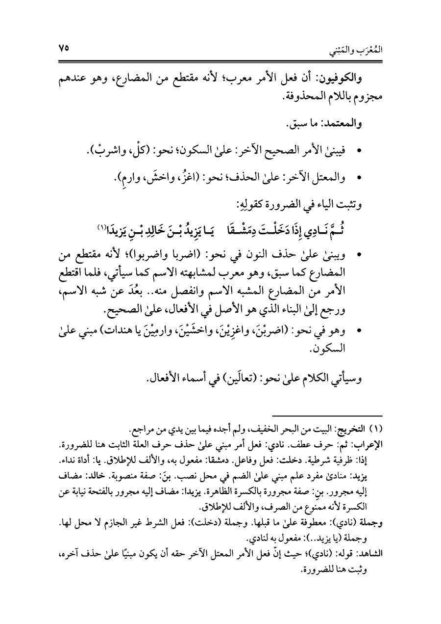 الشاهد: قوله: (نادي)؛ حيث إنّ فعل الأمر المعتل الآخر حقه أن يكون مبنيًا على حذف آخره، وثبت هنا للضرورة.