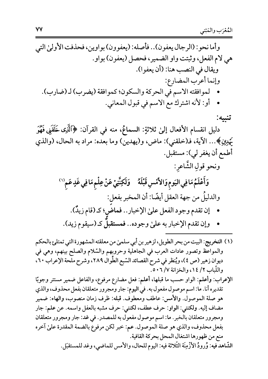 (¬١) التخريج: البيت من بحر الطويل، لزهير بن أبي سلمى من معلقته المشهورة التي تمتلئ بالحكم والمواعظ وتصور عادات العرب في الجاهلية وحروبهم والسّلام والصلح بينهم، وهي في ديوان زهير (ص ٤)، ويُنظر في شرح القصائد السّبع الطِّوال ٢٨٩، وشرح ملحة الإعراب ٦٠، واللّباب ٢/ ١٤ والخزانة ٧/ ٥٠٦.