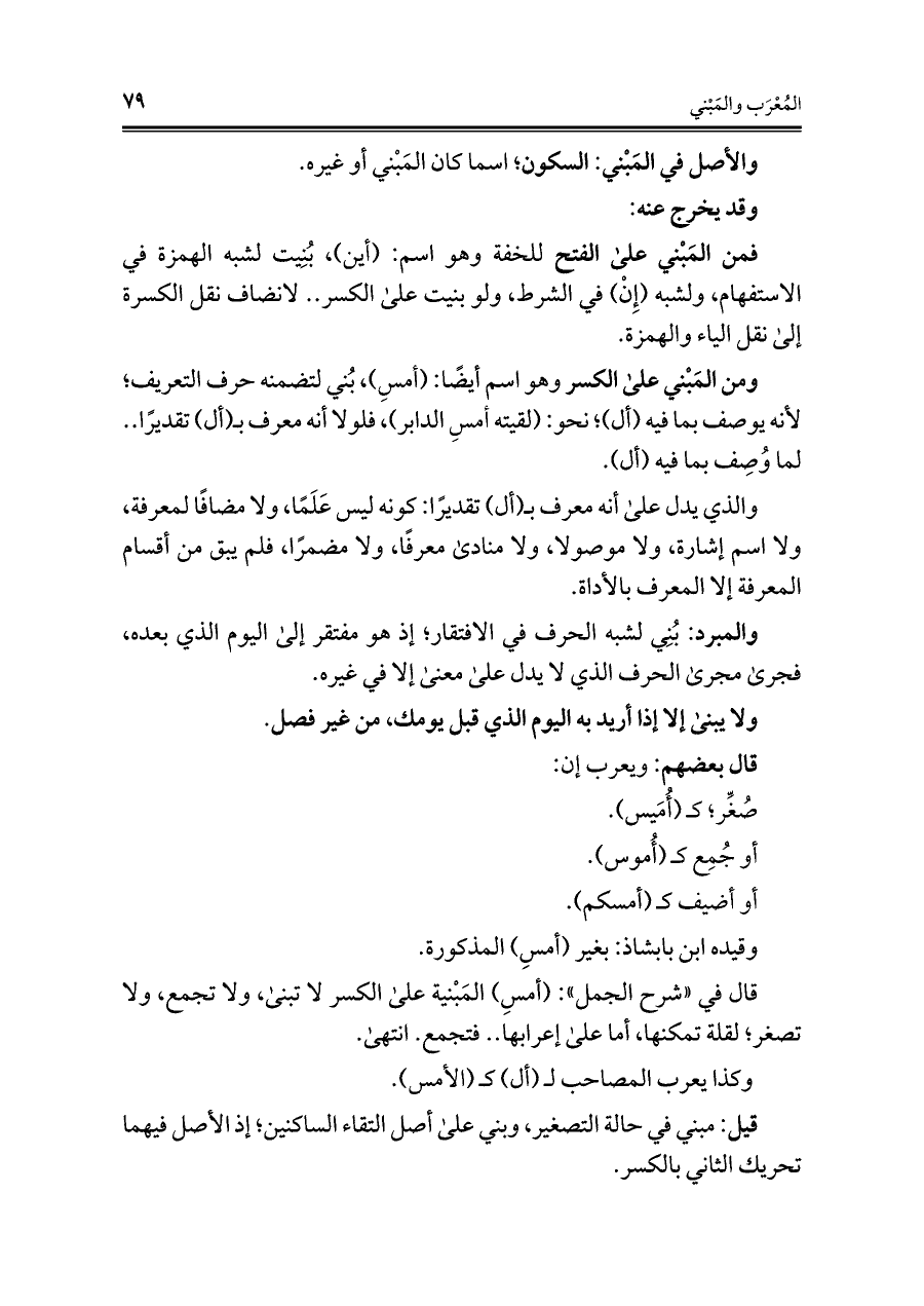ومن المَبْني على الكسر وهو اسم أيضًا: (أمسِ)، بُني لتضمنه حرف التعريف؛ لأنه يوصف بما فيه (أل)؛ نحو: (لقيته أمسِ الدابر)، فلولا أنه معرف بـ (أل) تقديرًا .. لما وُصِف بما فيه (أل).