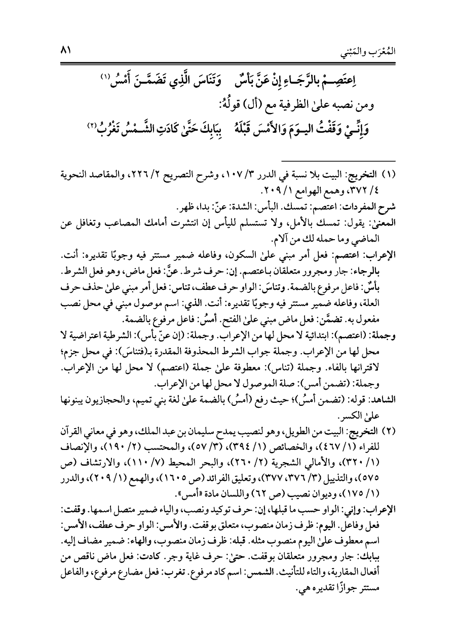 الإعراب: اعتصم: فعل أمر مبني على السكون، وفاعله ضمير مستتر فيه وجوبًا تقديره: أنت. بالرجاء: جار ومجرور متعلقان باعتصم. إن: حرف شرط. عنَّ: فعل ماض، وهو فعل الشرط. بأسٌ: فاعل مرفوع بالضمة. وتناسَ: الواو حرف عطف؛ تناس: فعل أمر مبني على حذف حرف العلّة، وفاعله ضمير مستتر فيه وجوبًا تقديره: أنت. الذي: اسم موصول مبني في محلّ نصب مفعول به. تضمَّن: فعل ماض مبني على الفتح. أمسُ: فاعل مرفوع بالضمة.
