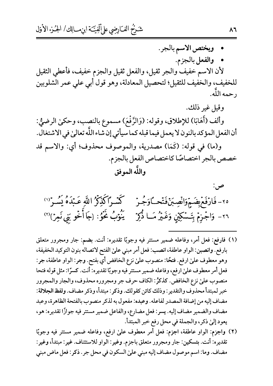 (¬١) فارفع: فعل أمر، وفاعله ضمير مستتر فيه وجوبًا تقديره: أنت. بضم: جار ومجرور متعلق بارفع. وانصبن: الواو عاطفة، أنصب: فعل أمر مبني على الفتح لاتصاله بنون التوكيد الخفيفة، وهو معطوف على ارفع. فتحًا: منصوب على نزع الخافض أي بفتح. وجرت الواو عاطفة، جر: فعل أمر معطوف على ارفع، وفاعله ضمير مستتر فيه وجوبًا تقديره: أنت. كسرًا: مثل قوله فتحا منصوب على نزع الخافض. كذكرُ: الكاف حرف جر ومجروره محذوف، والجار والمجرور خبر لمبتدأ محذوف والتقدير: وذلك كائن كقولك. وذكر: مبتدأ، وذكر مضاف. ولفظ الجلالة: مضاف إليه من إضافة المصدر لفاعله. وعبده: مفعول به لذكر منصوب بالفتحة الظاهرة، وعبد مضاف والضمير مضاف إليه. يسر: فعل مضارع، والفاعل ضمير مستتر فيه جوازًا تقديره: هو، يعود إلى ذكر، والجملة في محلّ رفع خبر المبتدأ.