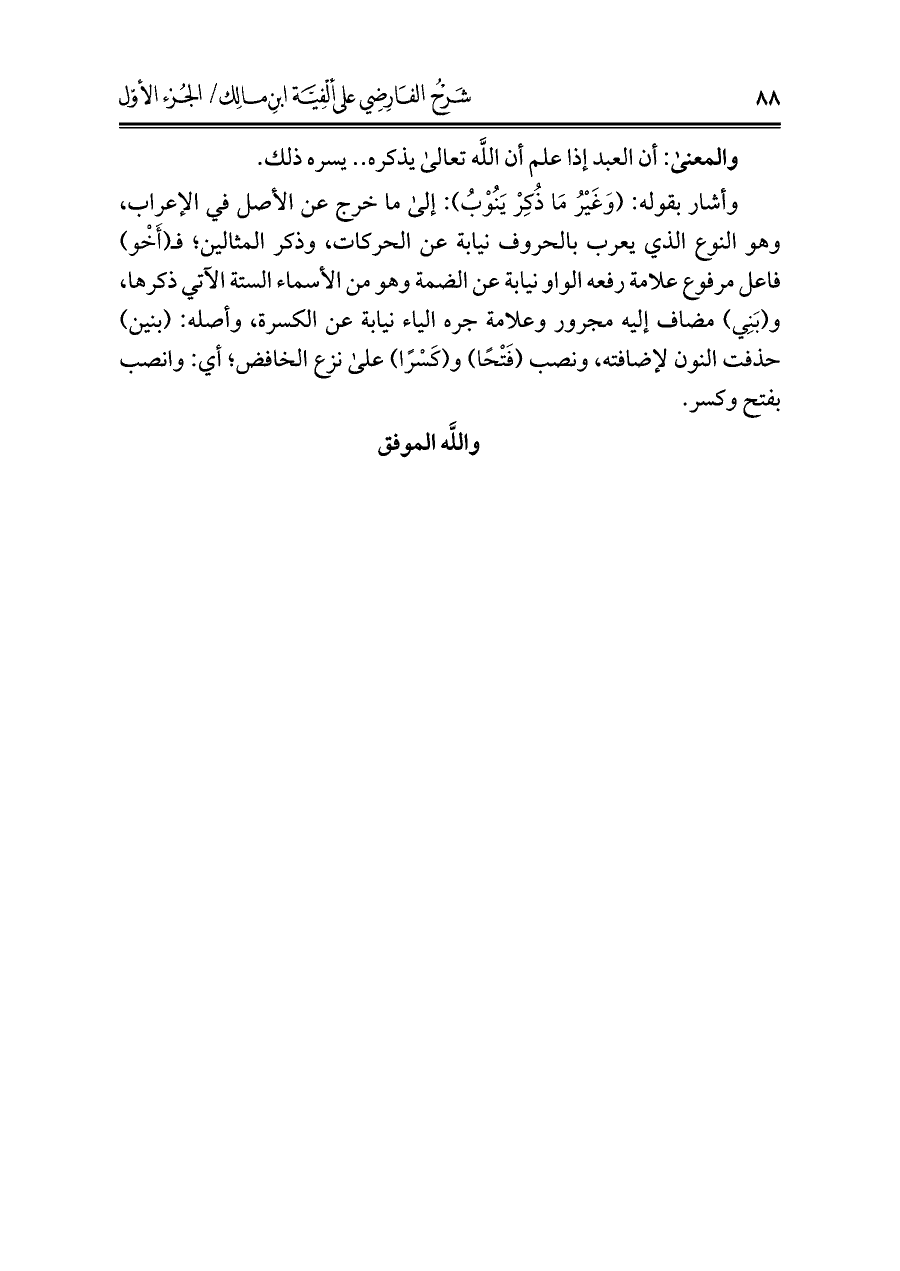 وأشار بقوله: (وَغَيْرُ مَا ذُكِرْ يَنُوْبُ): إلى ما خرج عن الأصل في الإعراب، وهو النوع الذي يعرب بالحروف نيابة عن الحركات، وذكر المثالين؛ فـ (أَخو) فاعل مرفوع علامة رفعه الواو نيابة عن الضمة وهو من الأسماء الستة الآتي ذكرها، و (بَنِي) مضاف إليه مجرور وعلامة جره الياء نيابة عن الكسرة، وأصله: (بنين) حذفت النون لإضافته، ونصب (فَتْحًا) و (كَسْرًا) على نزع الخافض؛ أي: وانصب بفتح وكسر.