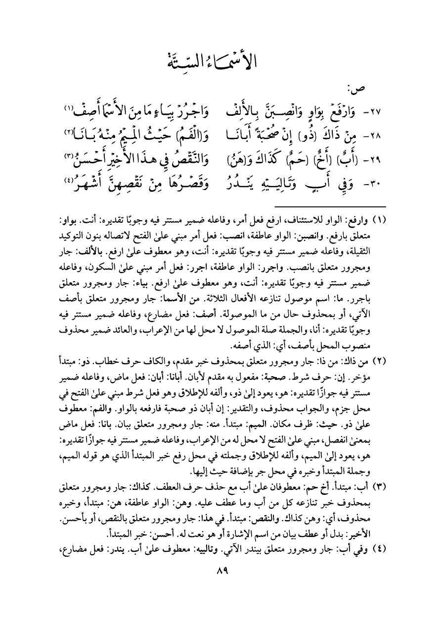 (¬١) وارفع: الواو للاستئناف، ارفع فعل أمر، وفاعله ضمير مستتر فيه وجوبًا تقديره: أنت. بواو: متعلق بارفع. وانصبن: الواو عاطفة، انصب: فعل أمر مبني على الفتح لاتصاله بنون التوكيد الثقيلة، وفاعله ضمير مستتر فيه وجوبًا تقديره: أنت، وهو معطوف على ارفع. بالألف: جار ومجرور متعلق بانصب. واجرر: الواو عاطفة، اجرر: فعل أمر مبني على السكون، وفاعله ضمير مستتر فيه وجوبًا تقديره: أنت، وهو معطوف على ارفع. بياء: جار ومجرور متعلق باجرر. ما: اسم موصول تنازعه الأفعال الثلاثة. من الأسما: جار ومجرور متعلق بأصف الآتي، أو بمحذوف حال من ما الموصولة. أصف: فعل مضارع، وفاعله ضمير مستتر فيه وجوبًا تقديره: أنا، والجملة صلة الموصول لا محل لها من الإعراب، والعائد ضمير محذوف منصوب المحل بأصف، أي: الذي أصفه.