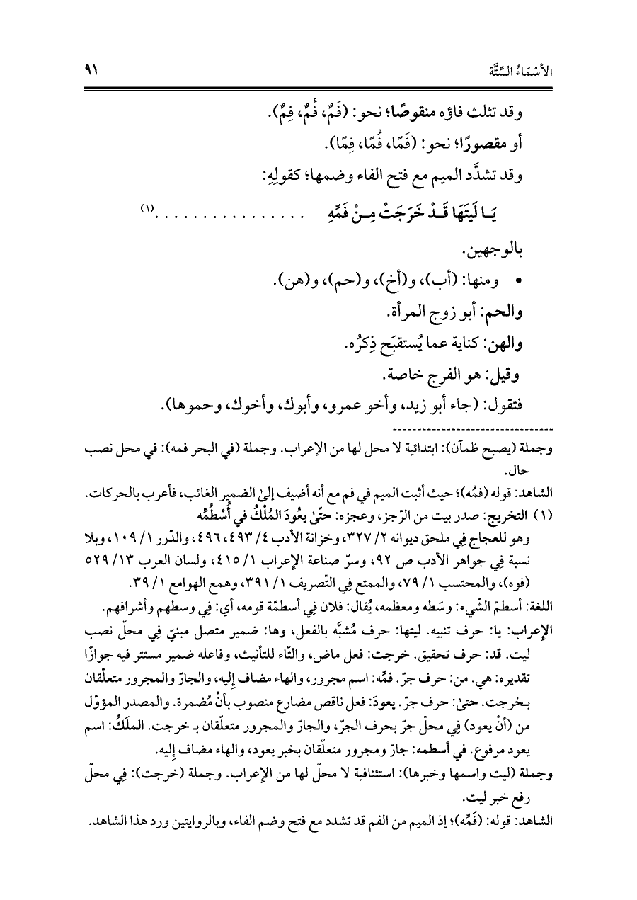 الشاهد: قوله (فمُه)؛ حيث أثبت الميم في فم مع أنه أضيف إلى الضمير الغائب، فأعرب بالحركات.