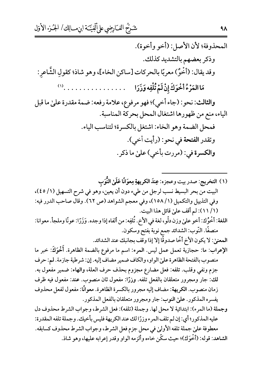 الشاهد: قوله: (أخْوَك)؛ حيث سكّن خاءه وألزمه الواو وقدر إعرابه عليها، وهو شاذ.