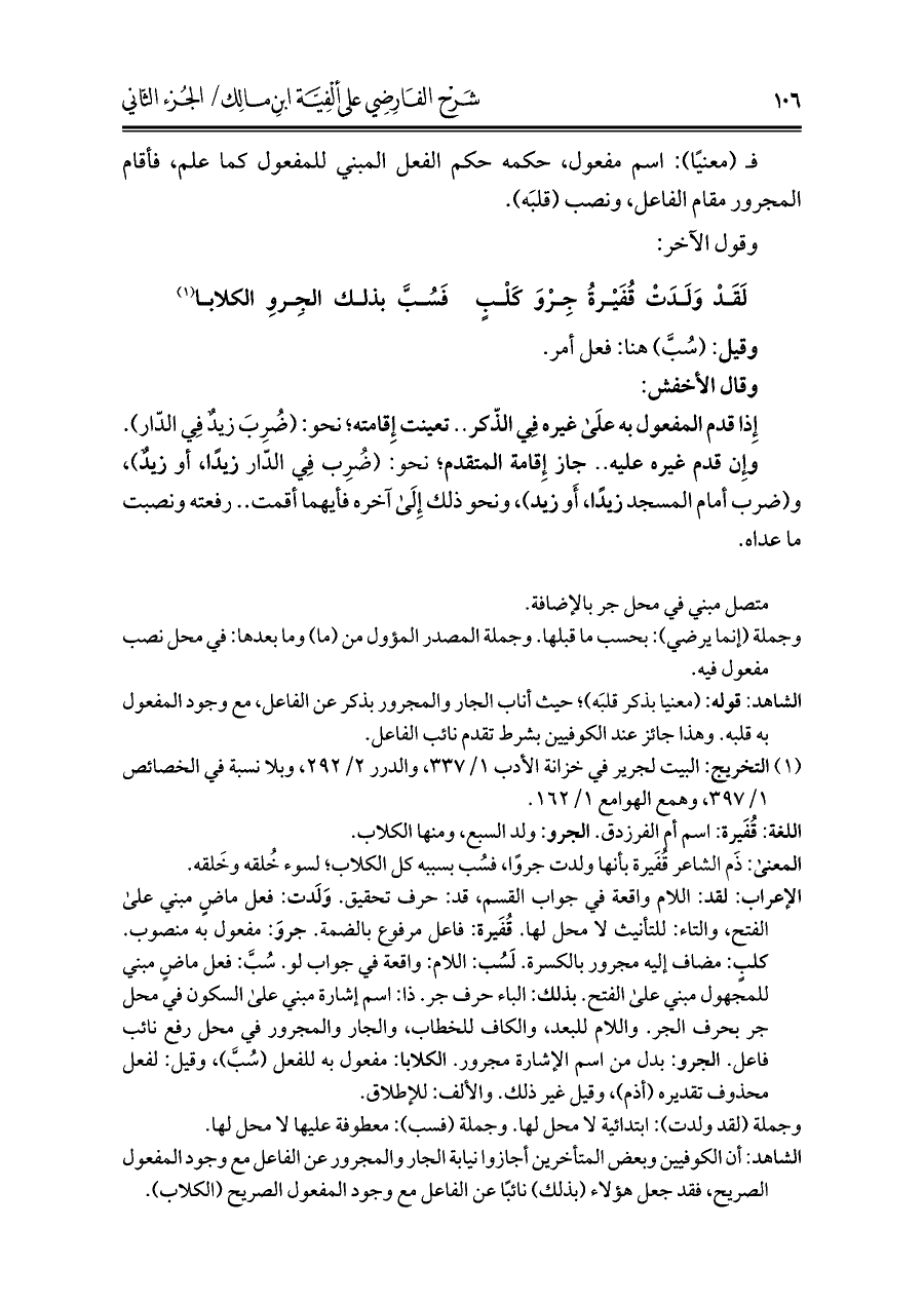 الشاهد: أن الكوفيين وبعض المتأخرين أجازوا نيابة الجار والمجرور عن الفاعل مع وجود المفعول الصريح، فقد جعل هؤلاء (بذلك) نائبًا عن الفاعل مع وجود المفعول الصريح (الكلاب).