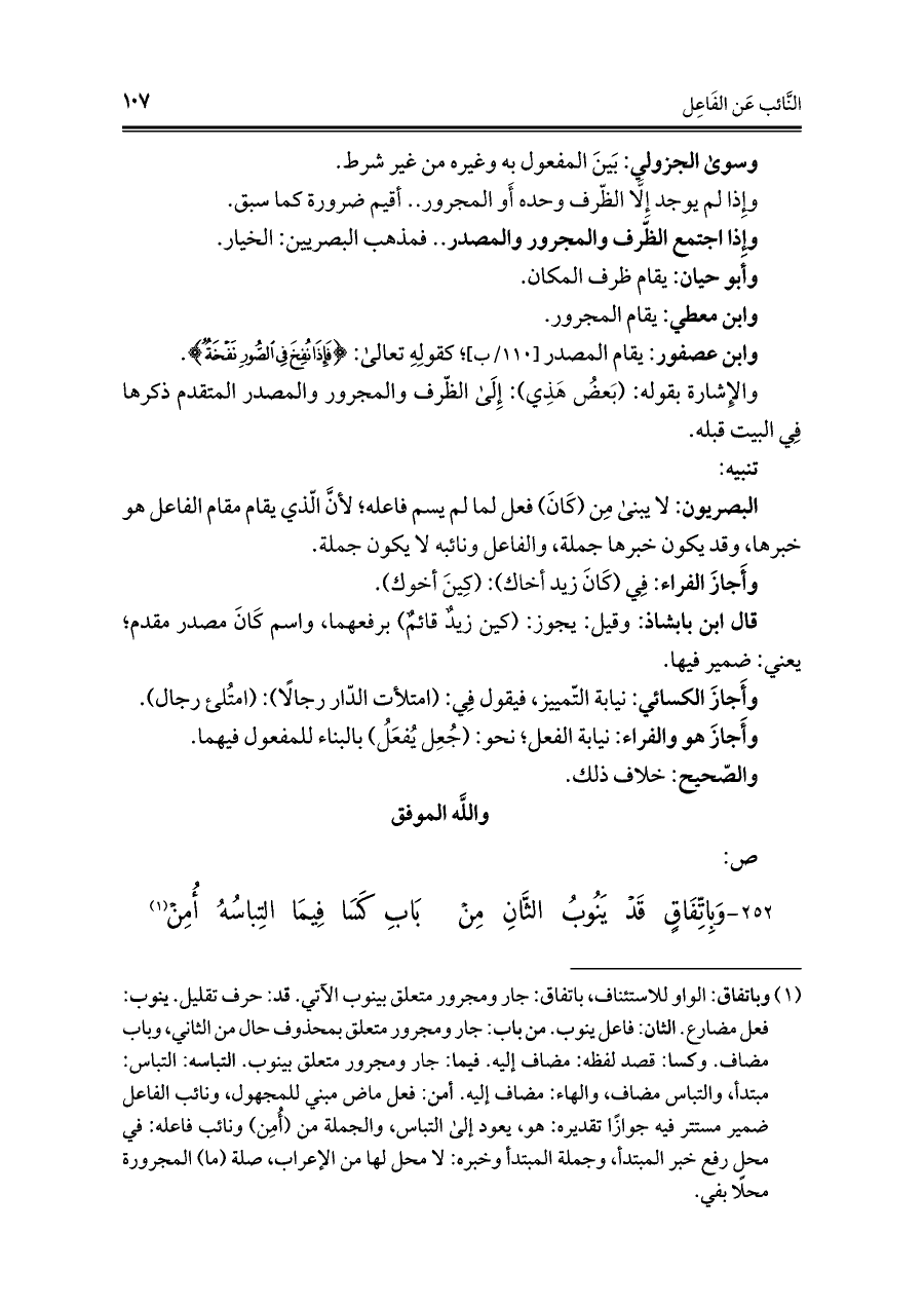 والإِشارة بقوله: (بعضُ هَذِي): إِلَى الظّرف والمجرور والمصدر المتقدم ذكرها فِي البيت قبله.