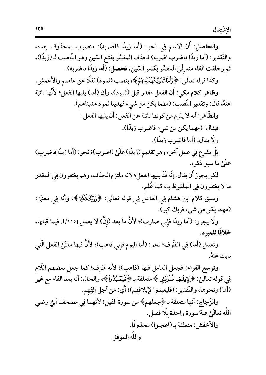 والحاصل: أَن الاسم فِي نحو: (أما زيدًا فاضربه): منصوب بمحذوف بعده، والتّقدير: (أما زيدًا فاضرب اضربه) فحذف المفسَّر بفتح السّين وهو الناصب لـ (زيدًا)، ثم زحلقت الفاء منه إِلَى المفسِّر بكسر السّين، فحصل: (أما زيدًا فاضربه).