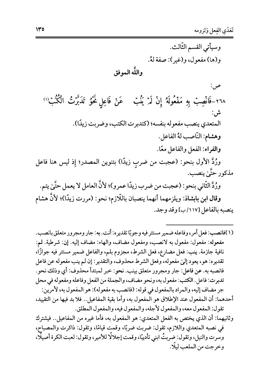 ٢٦٨ - فَانْصِبْ بِهِ مَفْعُولَهُ إِنْ لَمْ يَنُبْ ... عَنْ فَاعِلٍ نَحْوُ تَدَبَّرْتُ الْكُتُبْ (¬١)