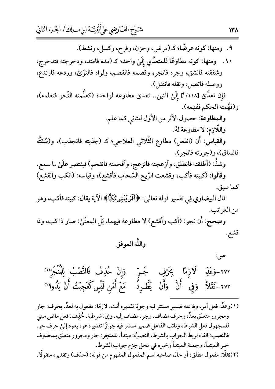 (¬١) وعدِّ: فعل أمر، وفاعله ضمير مستتر فيه وجوبًا تقديره أنت لازمًا مما: مفعول به لعدِّ. بحرف: جار ومجرور متعلق بعدِّ، وحرف مضاف. وجر: مضاف إليه. وإن شرطية. حُذِف: فعل ماض مبني للمجهول فعل الشرط، ونائب الفاعل ضمير مستتر فيه جوازًا تقديره هو، يعود إلى حرف جر. فالنصب: الفاء لربط الجواب بالشرط، النصبُ: مبتدأ. للمنجر: جار ومجرور متعلق بمحذوف خبر المبتدأ، وجملة المبتدأ وخبره في محل جزم جواب الشرط.