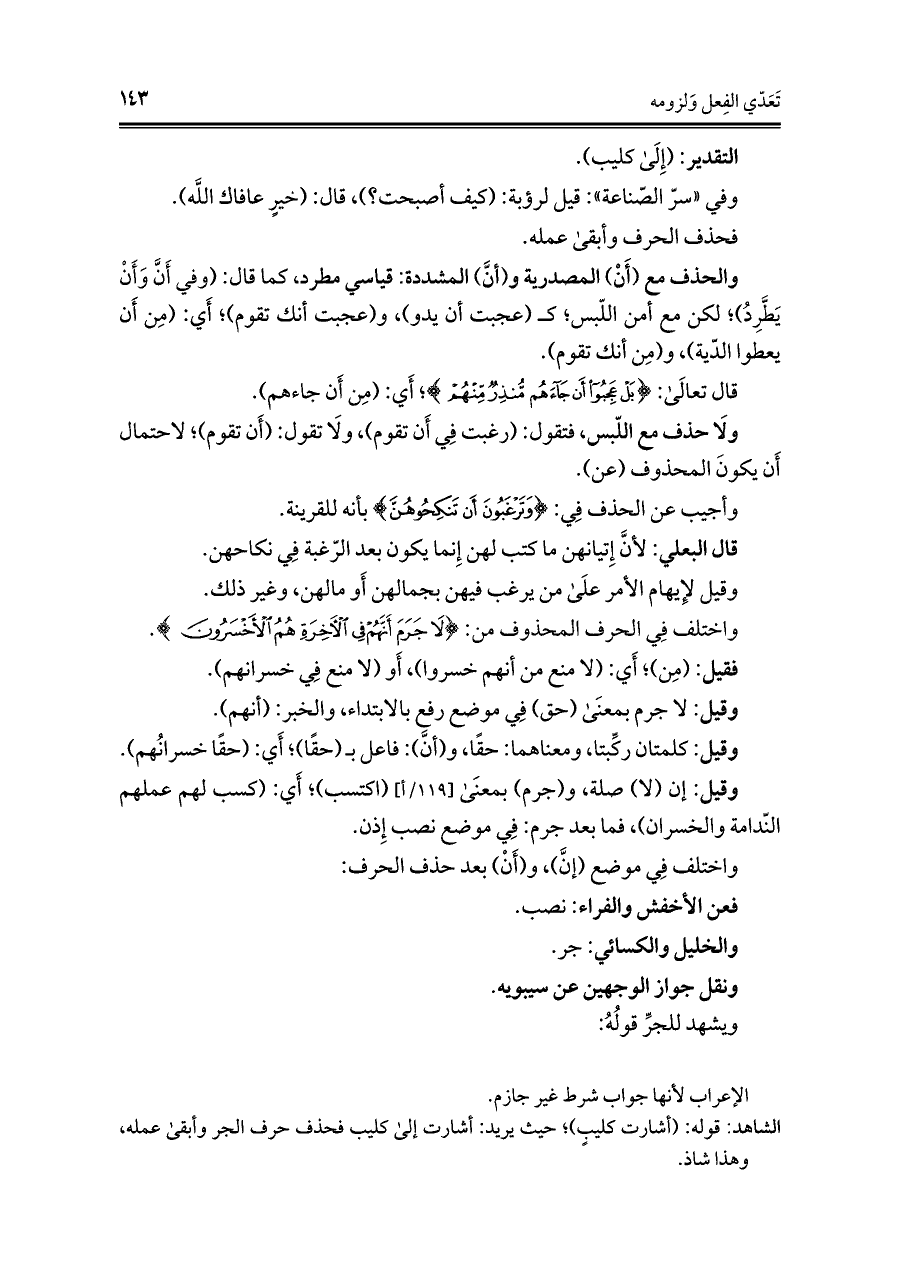ولَا حذف مع اللّبس، فتقول: (رغبت فِي أَن تقوم)، ولَا تقول: (أَن تقوم)؛ لاحتمال أَن يكونَ المحذوف (عن).