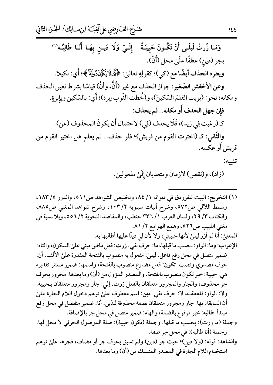 الإعراب: ما: الواو: بحسب ما قبلها، ما: حرف نفي. زرت: فعل ماض مبني على السكون، والتاء: ضمير متصل في محل رفع فاعل. ليلى: مفعول به منصوب بالفتحة المقدرة على الألف. أن: حرف مصدري ونصب. تكون: فعل مضارع منصوب بالفتحة، واسمها: ضمير مستتر تقديره هي. حبيبة: خبر تكون منصوب بالفتحة. والمصدر المؤول من (أن) وما بعدها: مجرور بحرف جر محذوف، والجار والمجرور متعلقان بالفعل زرت. إلى: جار ومجرور متعلقان بحبيبة. ولا: الواو: للعطف، لا: حرف نفي. دين: اسم معطوف على توهم دخول اللام الجارة على أن السابقة. بها: جار ومجرور متعلقان بصفة محذوفة لدَين. أنا: ضمير منفصل في محل رفع مبتدأ. طالبه: خبر مرفوع بالضمة، والهاء: ضمير متصل في محل جر بالإضافة.