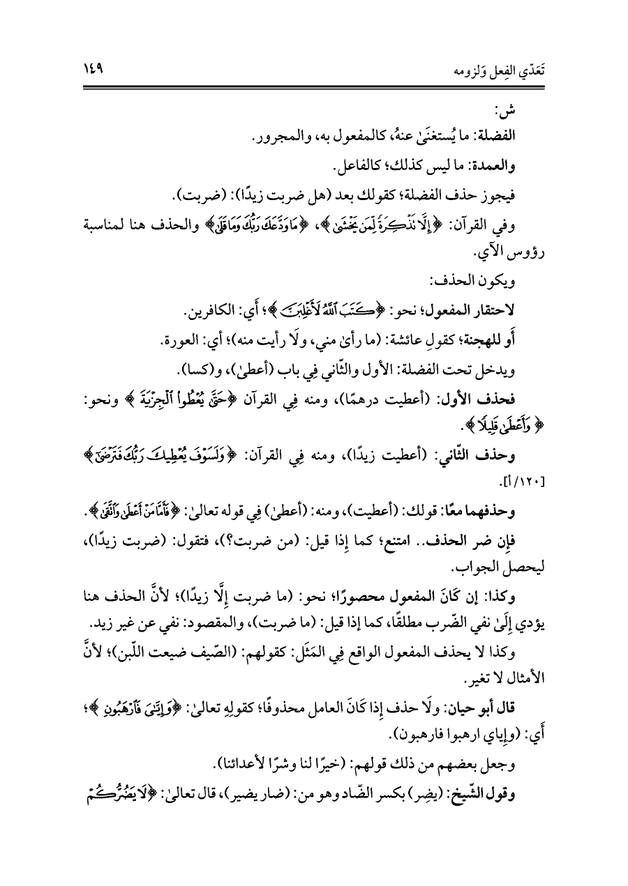 وحذف الثّاني: (أعطيت زيدًا)، ومنه فِي القرآن: {وَلَسَوْفَ يُعْطِيكَ رَبُّكَ فَتَرْضَى}.