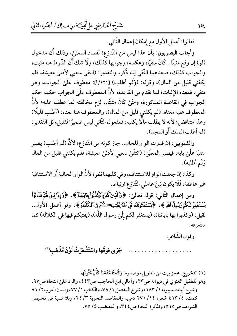 وأجاب البصريون: بأن هذا ليس من التّنازع؛ لفساد المعنَى، وذلك أَن مدخول (لو) إن وقع مثبتًا. . كَانَ منفيًا، وعكسه، وجوابها كذلك، ولَا شك أَن الشّرط هنا مثبت، والجواب كذلك، فمعناهما النّفي لِمَا ذُكر، والتقدير: (انتفى سعيي لأدنى معيشة، فلم يكفني قليل من المال)، وقوله: (وَلَم أطلب): معطوف علَى الجواب، وهو منفي، فمعناه الإِثبات؛ لما تقدم من القاعدة؛ لأنَّ المعطوف علَى الجواب حكمه حكمِ الجواب فِي القاعدة المذكورة، ومتَى كَانَ مثبتًا. . لزم مخالفته لما عطف عليه؛ لأنَّ المعطوف عليه معناه: (لم يكفني قليل من المال)، والمعطوف هنا معناه: (أطلب قليلًا) وهذا متناقض؛ لأنه لا يطلب مالًا يكفيه، فمفعول الثّاني ليس ضميرًا لقليل، بَل التّقدير: (لم أطلب الملك أَو المجد).
