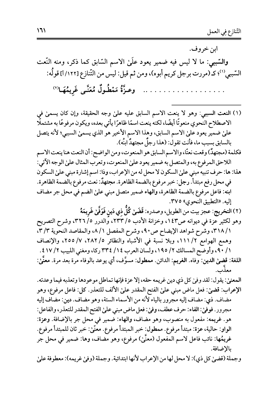 الإعراب: قضى: فعل ماض مبني على الفتح المقدر على الألف للتعذر. كل: فاعل مرفوع، وهو مضاف. ذي: مضاف إليه مجرور بالياء لأنه من الأسماء الستة، وهو مضاف. دين: مضاف إليه مجرور. فوفى: الفاء: حرف عطف، وفى: فعل ماض مبني على الفتح المقدر للتعذر، والفاعل: هو غريمه: مفعول به منصوب، وهو مضاف، والهاء: ضمير في محل جر بالإضافة. وعزة: الواو: حالية، عزة: مبتدأ مرفوع. ممطول: خبر المبتدأ مرفوع. معنّى: خبر ثان للمبتدأ مرفوع. غريمُها: نائب فاعل لاسم المفعول (معنَّى) مرفوع، وهو مضاف، وها: ضمير في محل جر بالإضافة.
