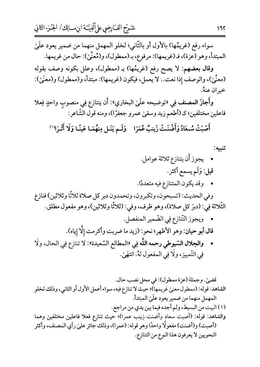 والشاهد: قوله: (أصبت سعاد وأضنت زينب عمرا)؛ حيث تنازع فعلا فاعلين مختلفين وهما (أصبت) و (أضنت) مفعولًا واحدًا وهو قوله: (عمرا)، وذلك جائز على رأي المصنف، وأكثر النحويين لا يعرفون هذا النوع من التنازع.