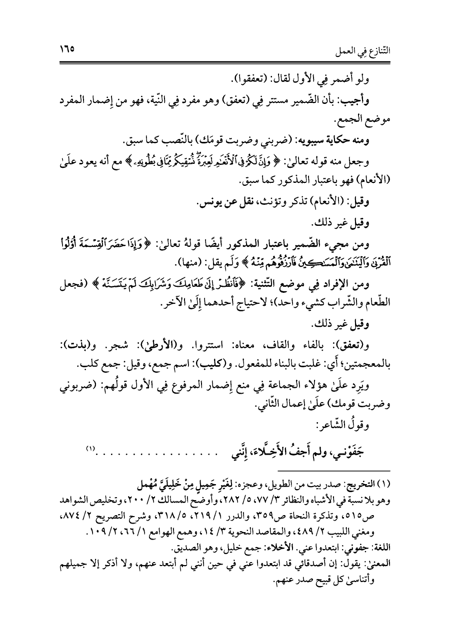 ويَرِد علَى هؤلاء الجماعة فِي منع إِضمار المرفوع فِي الأول قولُهم: (ضربوني وضربت قومك) علَى إعمال الثّاني.