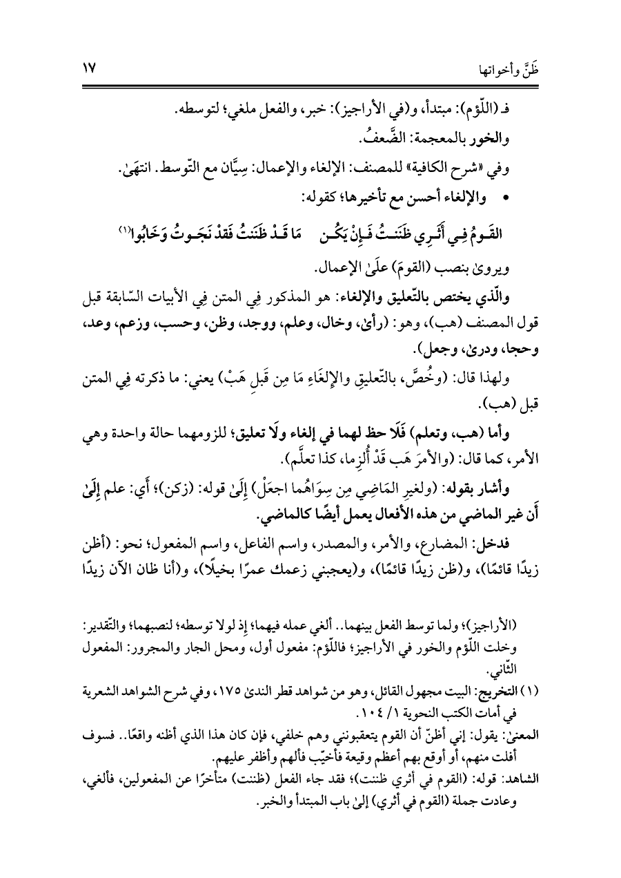 الشاهد: قوله: (القوم في أثري ظننت)؛ فقد جاء الفعل (ظننت) متأخرًا عن المفعولين، فألغي، وعادت جملة (القوم في أثري) إلى باب المبتدأ والخبر.
