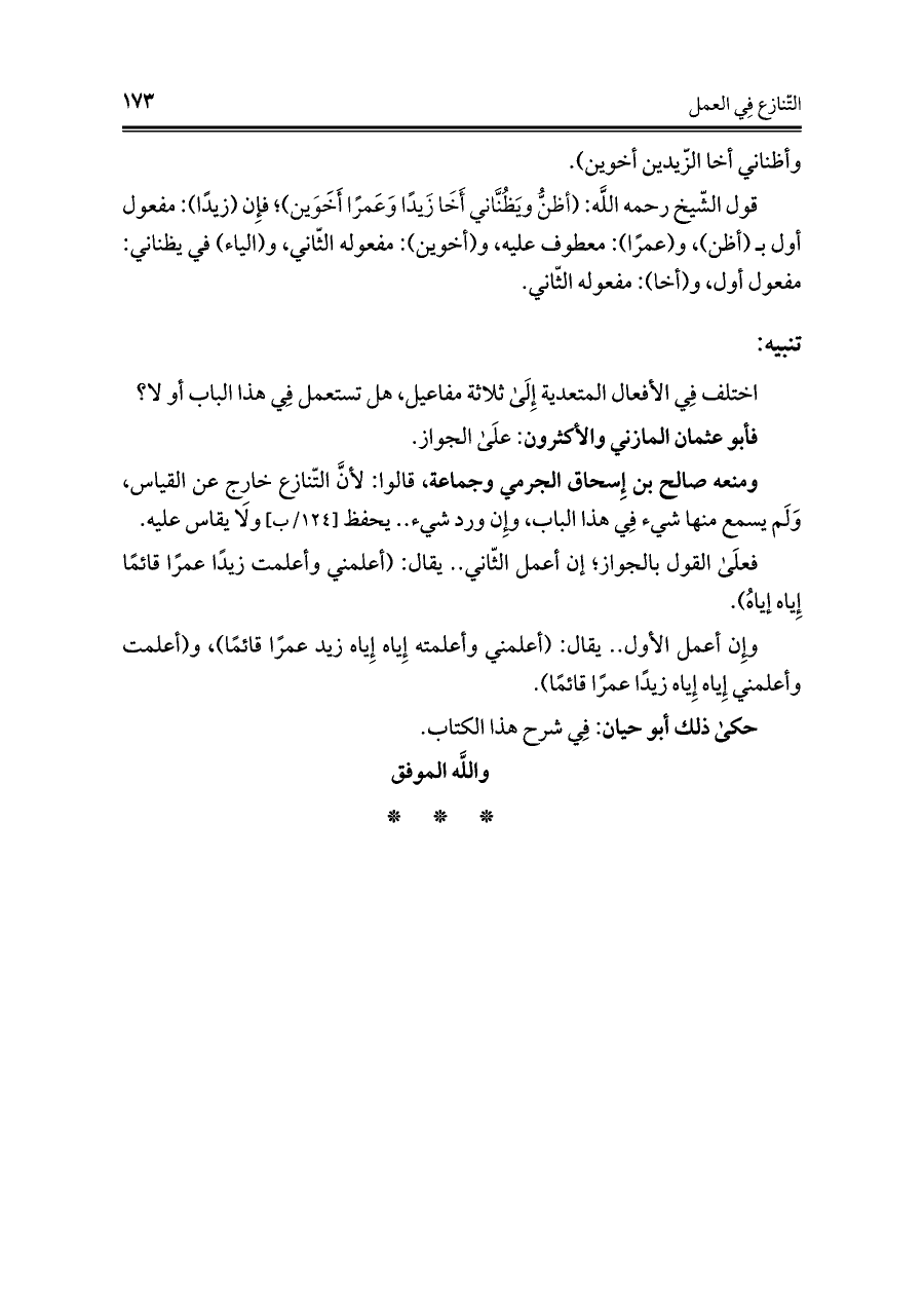 قول الشّيخ رحمه اللَّه: (أظنُّ ويَظُنَّاني أَخَا زَيدًا وَعَمرًا أَخَوَين)؛ فإِن (زيدًا): مفعول أول بـ (أظن)، و (عمرًا): معطوف عليه، و (أخوين): مفعوله الثّاني، و (الياء) في يظناني: مفعول أول، و (أخا): مفعوله الثّاني.
