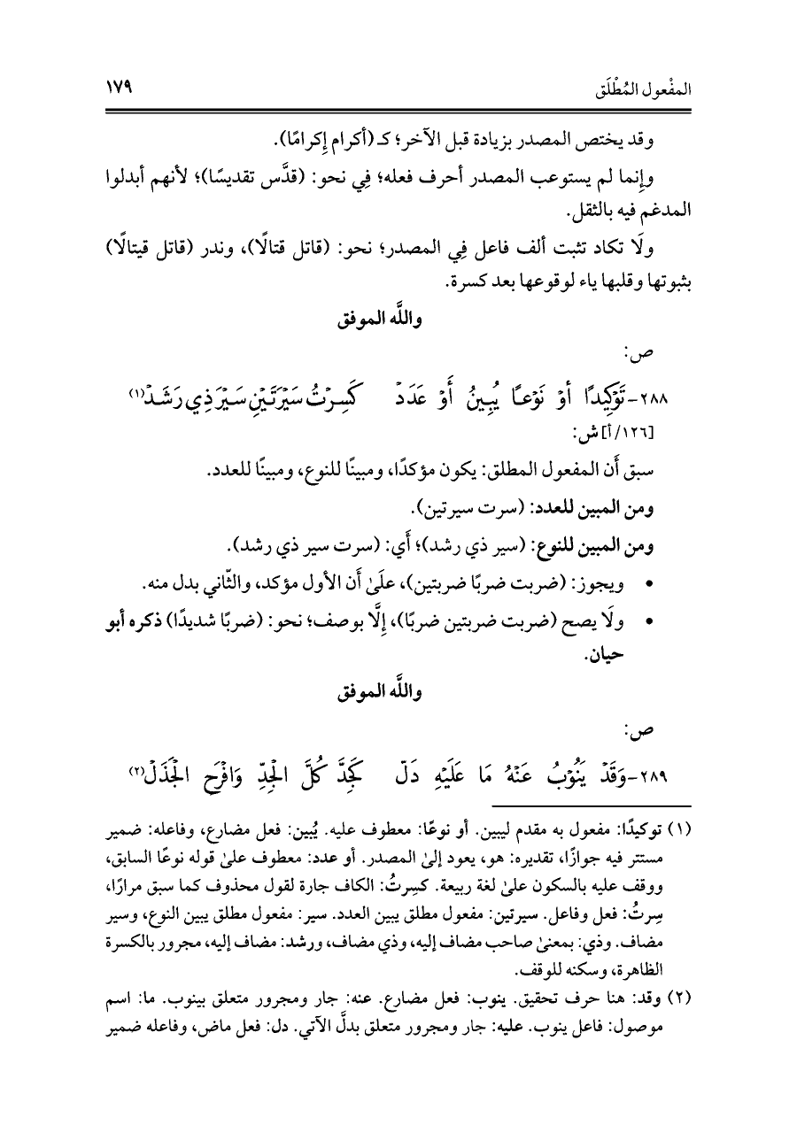 ٢٨٨ - تَوْكِيدًا أو نَوْعًا يُبِينُ أَوْ عَدَدْ ... كَسِرْتُ سَيْرَتَيْنِ سَيْرَذِي رَشَدْ (¬١)