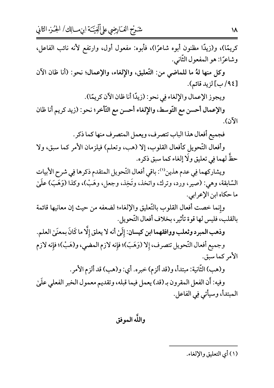 وأفعال التّحويل كأفعال القلوب، إلا (هب، وتعلم) فيلزمان الأمر كما سبق، ولا حظَّ لهما فِي تعليق ولَا إلغاء كما سبق ذكره.