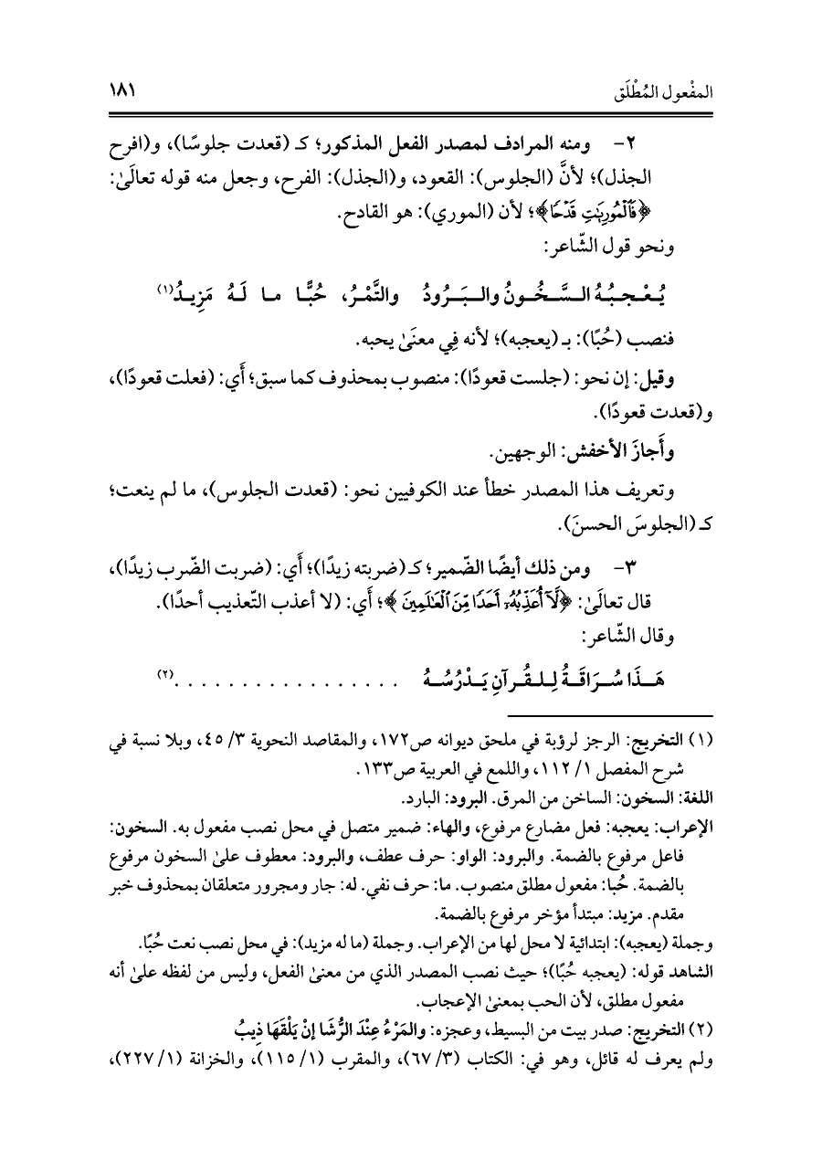 وتعريف هذا المصدر خطأ عند الكوفيين نحو: (قعدت الجلوس)، ما لم ينعت؛ كـ (الجلوسَ الحسنَ).