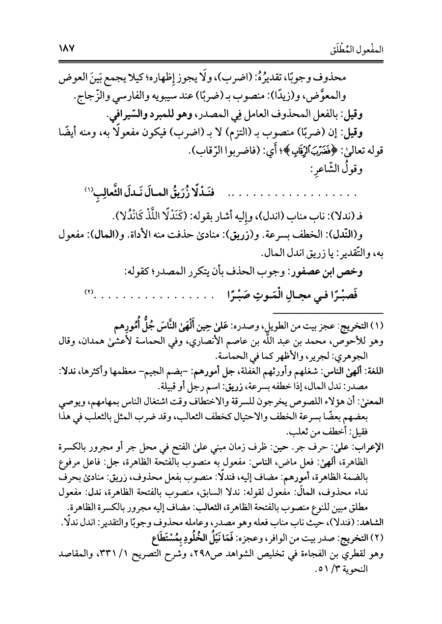 وقيل: إن (ضربًا) منصوب بـ (التزم) لا بـ (اضرب) فيكون مفعولًا به، ومنه أيضًا قوله تعالى: {فَضَرْبَ الرِّقَابِ}؛ أَي: (فاضربوا الرّقاب).