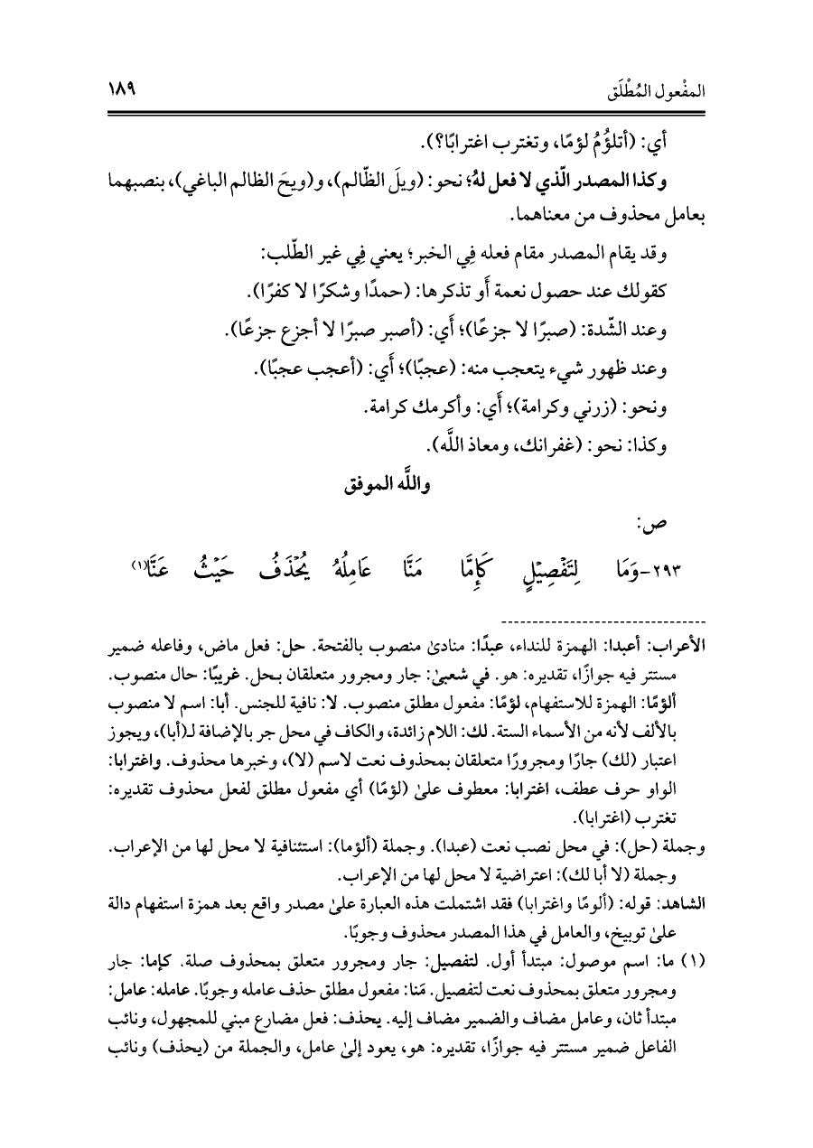 (¬١) ما: اسم موصول: مبتدأ أول. لتفصيل: جار ومجرور متعلق بمحذوف صلة: كإما: جار ومجرور متعلق بمحذوف نعت لتفصيل. مَنا: مفعول مطلق حذف عامله وجوبًا. عامله: عامل: مبتدأ ثان، وعامل مضاف والضمير مضاف إليه. يحذف: فعل مضارع مبني للمجهول، ونائب الفاعل ضمير مستتر فيه جوازًا، تقديره: هو، يعود إلى عامل، والجملة من (يحذف) ونائب =