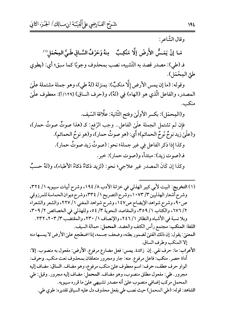 الإعراب: ما: حرف نفي. إن زائدة. يمس: فعل مضارع مرفوع. الأرض: مفعول به منصوب. إلا: أداة حصر. منكب: فاعل مرفوع. منه: جار ومجرور متعلقان بمحذوف نعت منكب. وحرف: الواو حرف عطف، حرف: اسم معطوف على منكب مرفوع، وهو مضاف. الساق: مضاف إليه مجرور. طي: مفعول مطلق منصوب، وهو مضاف. المحمل: مضاف إليه مجرور. وقيل: طي المحمل مركب إضافي منصوب على أنه مصدر تشبيهي على ما قرره سيبويه.
