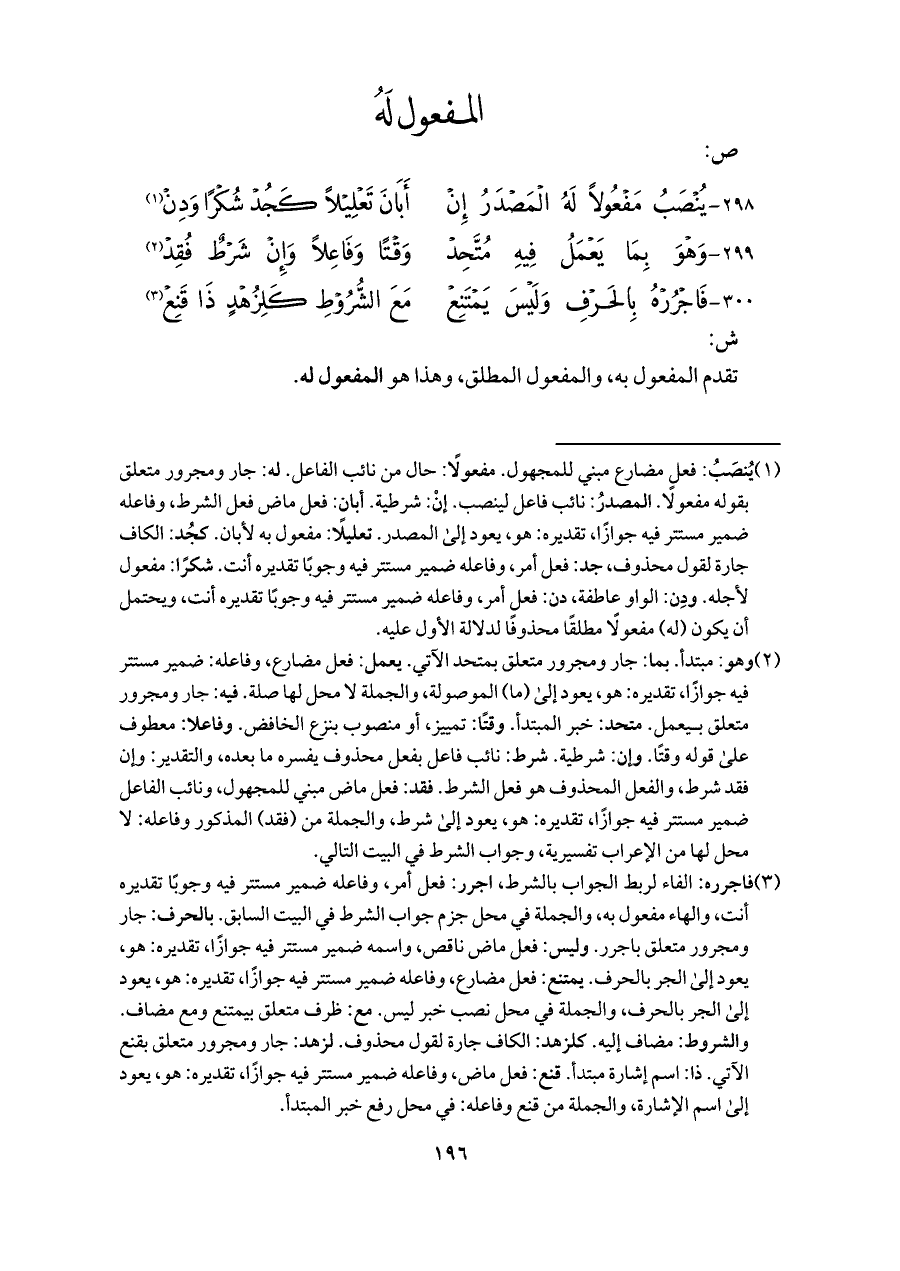 (¬١) يُنصَبُ: فعل مضارع مبني للمجهول. مفعولًا: حال من نائب الفاعل. له: جار ومجرور متعلق بقوله مفعولًا. المصدرُ. نائب فاعل لينصب: إنْ: شرطية: أبان: فعل ماض فعل الشرط، وفاعله ضمير مستتر فيه جوازًا، تقديره: هو، يعود إلى المصدر. تعليلًا: مفعول به لأبان. كجُد: الكاف جارة لقول محذوف، جد: فعل أمر، وفاعله ضمير مستتر فيه وجوبًا تقديره أنت. شكرًا: مفعول لأجله. ودِن: الواو عاطفة، دن: فعل أمر، وفاعله ضمير مستتر فيه وجوبًا تقديره أنت، ويحتمل أن يكون (له) مفعولًا مطلقًا محذوفًا لدلالة الأول عليه.