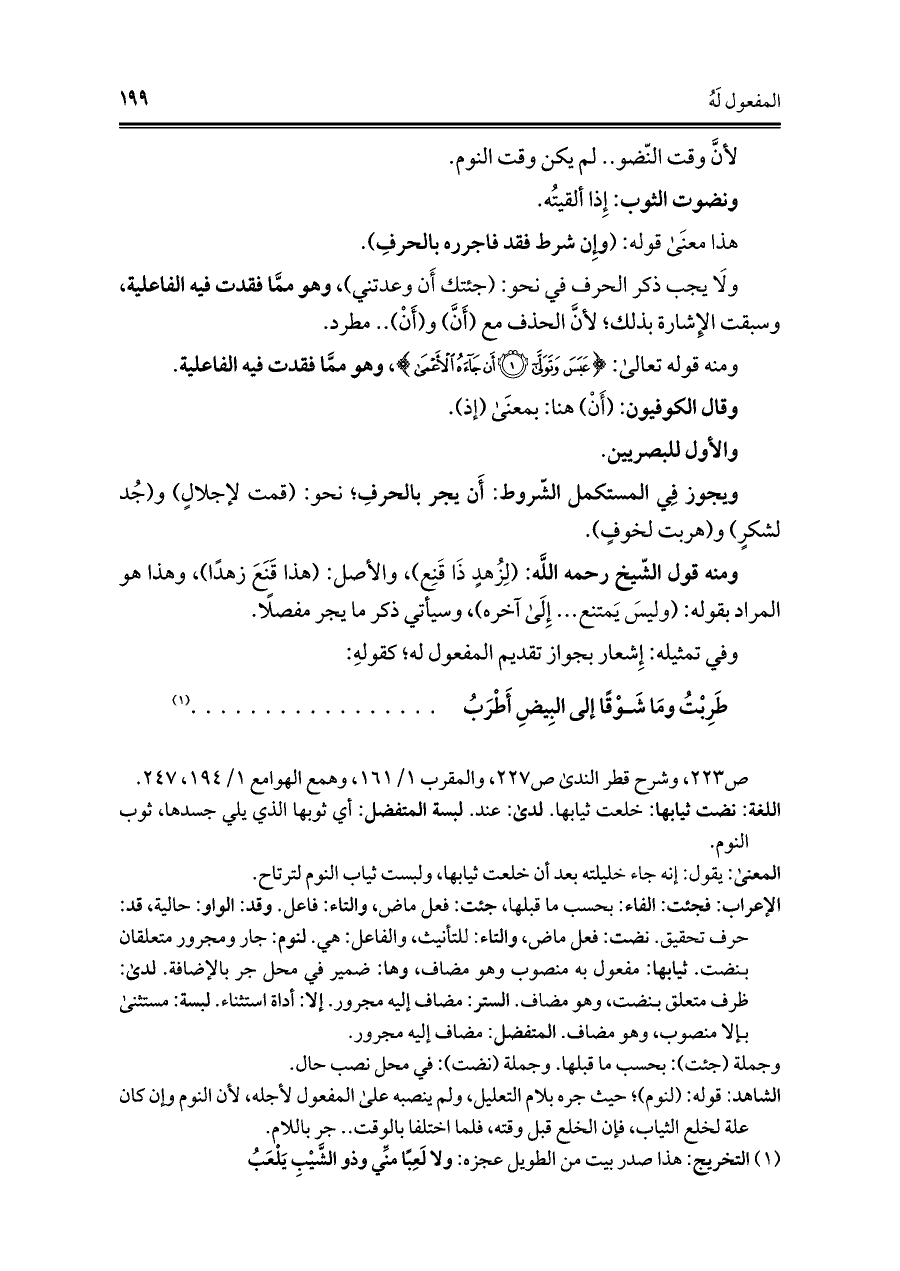 الشاهد: قوله: (لنوم)؛ حيث جره بلام التعليل، ولم ينصبه على المفعول لأجله، لأن النوم وإن كان علة لخلع الثياب، فإن الخلع قبل وقته، فلما اختلفا بالوقت. . جر باللام.