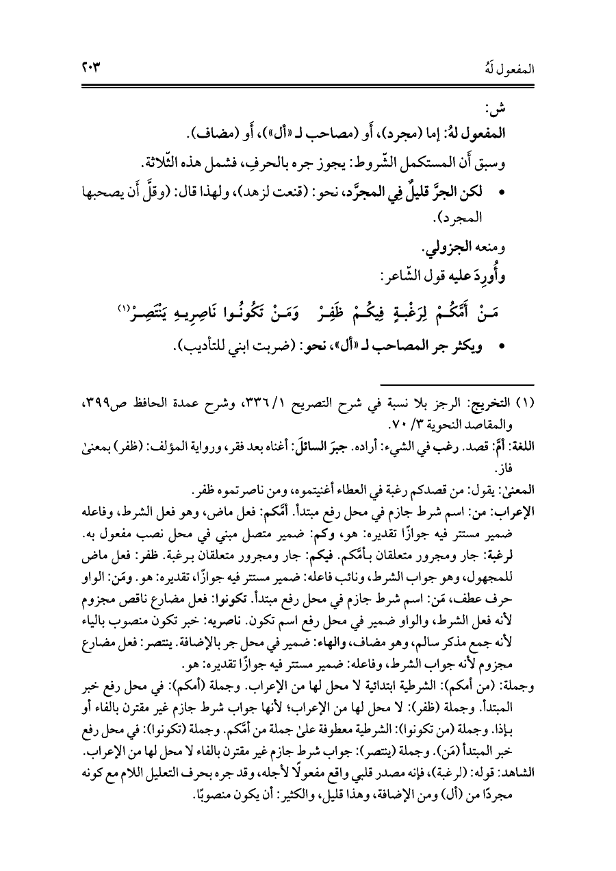 الشاهد: قوله: (لرغبة)، فإنه مصدر قلبي واقع مفعولًا لأجله، وقد جره بحرف التعليل اللام مع كونه مجردًا من (أل) ومن الإضافة، وهذا قليل، والكثير: أن يكون منصوبًا.