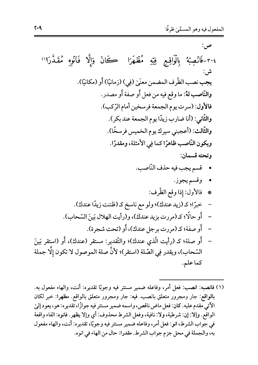 ٣٠٤ - فَانْصِبْهُ بِالوَاقِعِ فِيهِ مُظْهَرَا ... كَنَ وَإِلَّا فَانْوِهِ مُقَدَّرَا (¬١)