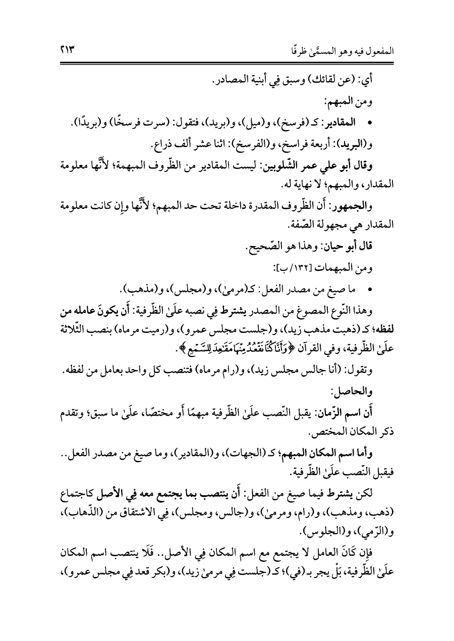 وقال أبو علي عمر الشّلوبين: ليست المقادير من الظروف المبهمة؛ لأنها معلومة المقدار، والمبهم؛ لا نهاية له.