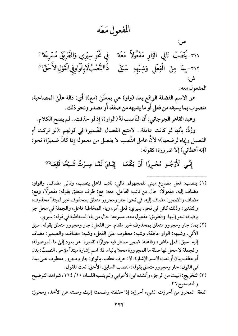 (¬١) ينصب: فعل مضارع مبني للمجهول. تالي: نائب فاعل ينصب، وتالي مضاف. والواو: مضاف إليه. مفعولًا: حال من نائب الفاعل. معه: مع: ظرف متعلق بقوله: مفعولًا، ومع: مضاف والضمير: مضاف إليه. في نحو: جار ومجرور متعلق بمحذوف خبر لمبتدأ محذوف، والتقدير: وذلك كائن في نحو. سِيري: فعل أمر، وياء المخاطبة فاعل، والجملة في محل جر بإضافة نحو إليها. والطريق: مفعول معه. مسرعه: حال من ياء المخاطبة في قوله: سيري.