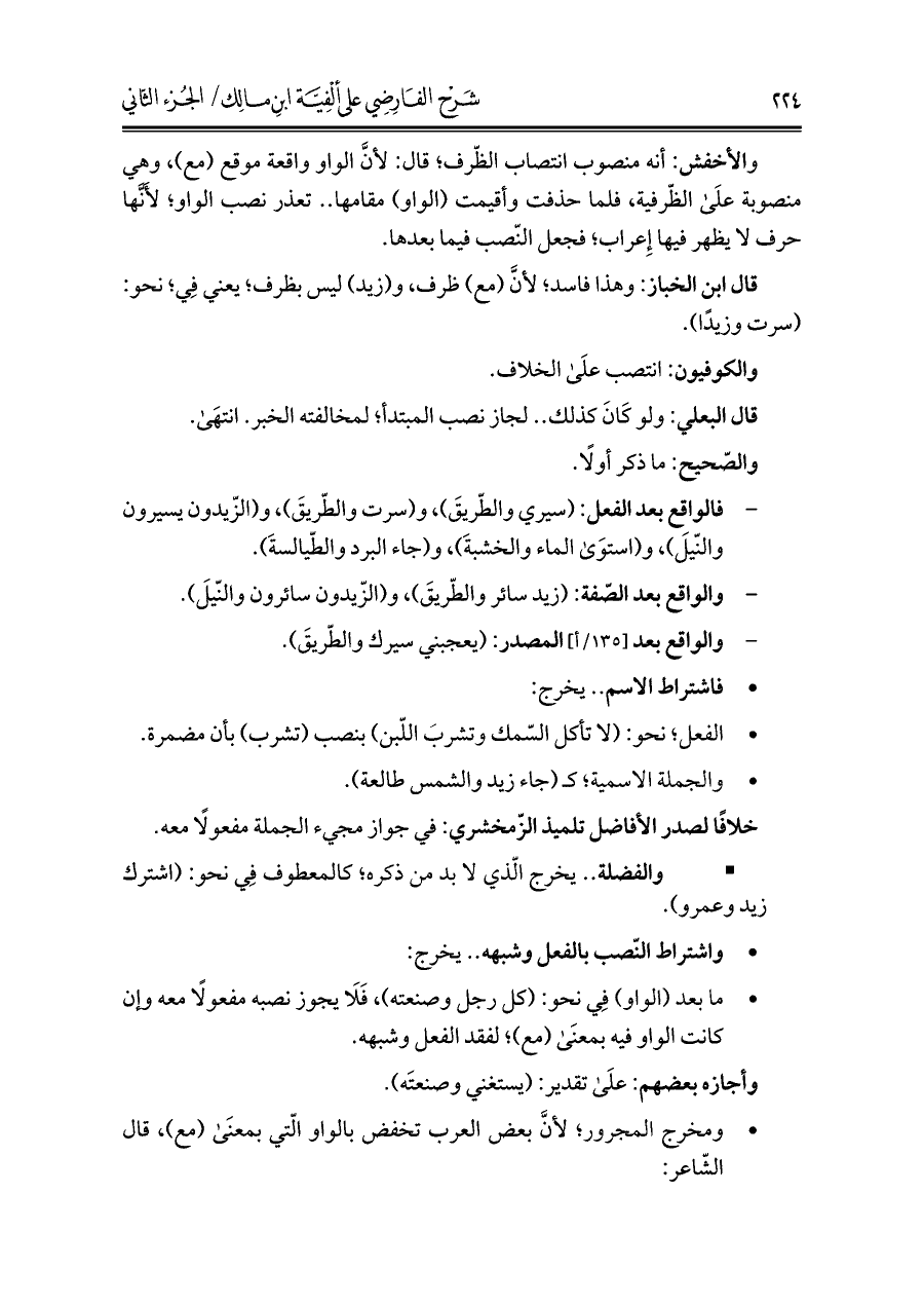 والأخفش: أنه منصوب انتصاب الظّرف؛ قال: لأنَّ الواو واقعة موقع (مع)، وهي منصوبة علَى الظّرفية، فلما حذفت وأقيمت (الواو) مقامها .. تعذر نصب الواو؛ لأَنَّها حرف لا يظهر فيها إِعراب؛ فجعل النّصب فيما بعدها.