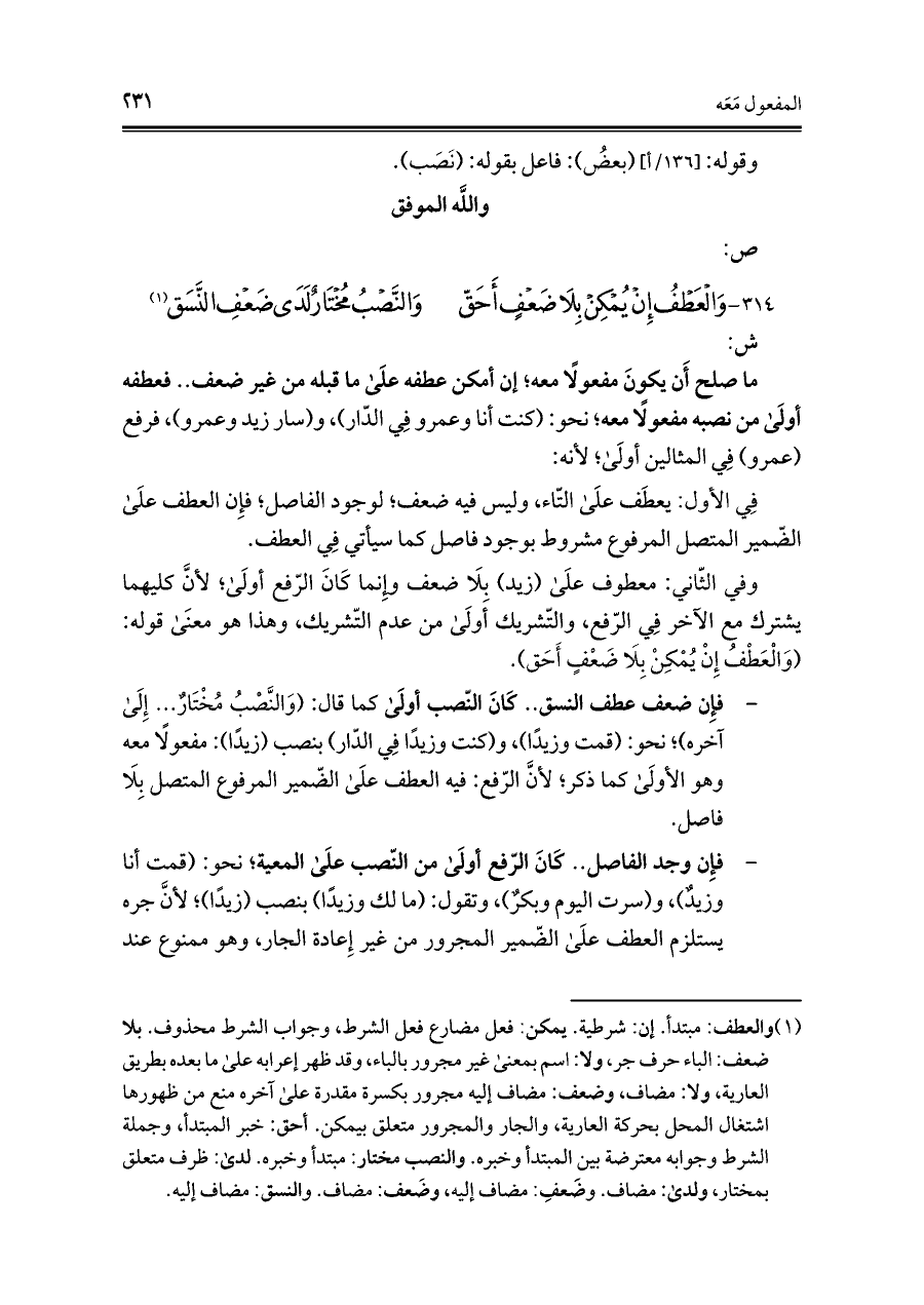 ٣١٤ - وَالعَطْفُ إِنْ يُمْكِنْ بِلَا ضَعْفٍ أَحَقّ ... وَالنَّصْبُ مُخْتَارٌ لَدَى ضَعْفِ النَّسَق (¬١)