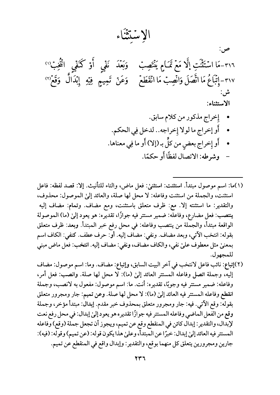 (¬١) ما: اسم موصول مبتدأ. استثنت: استثنى: فعل ماض، والتاء للتأنيث. إلا: قصد لفظه: فاعل استثنت، والجملة من استثنت وفاعله: لا محل لها صلة، والعائد إلى الموصول: محذوف، والتقدير: ما استثنته إلا. مع: ظرف متعلق باستثنت، ومع مضاف. وتمام: مضاف إليه ينتصب: فعل مضارع، وفاعله: ضمير مستتر فيه جوازًا، تقديره: هو يعود إلى (ما) الموصولة الواقعة مبتدأ، والجملة من ينتصب وفاعله: في محل رفع خبر المبتدأ. وبعد: ظرف متعلق بقوله: انتخب الآتي، وبعد مضاف. ونفى: مضاف إليه. أو: حرف عطف. كنفى: الكاف اسم بمعنى مثل معطوف على نفي، والكاف مضاف، ونفى: مضاف إليه. انتخب: فعل ماض مبني للمجهول.