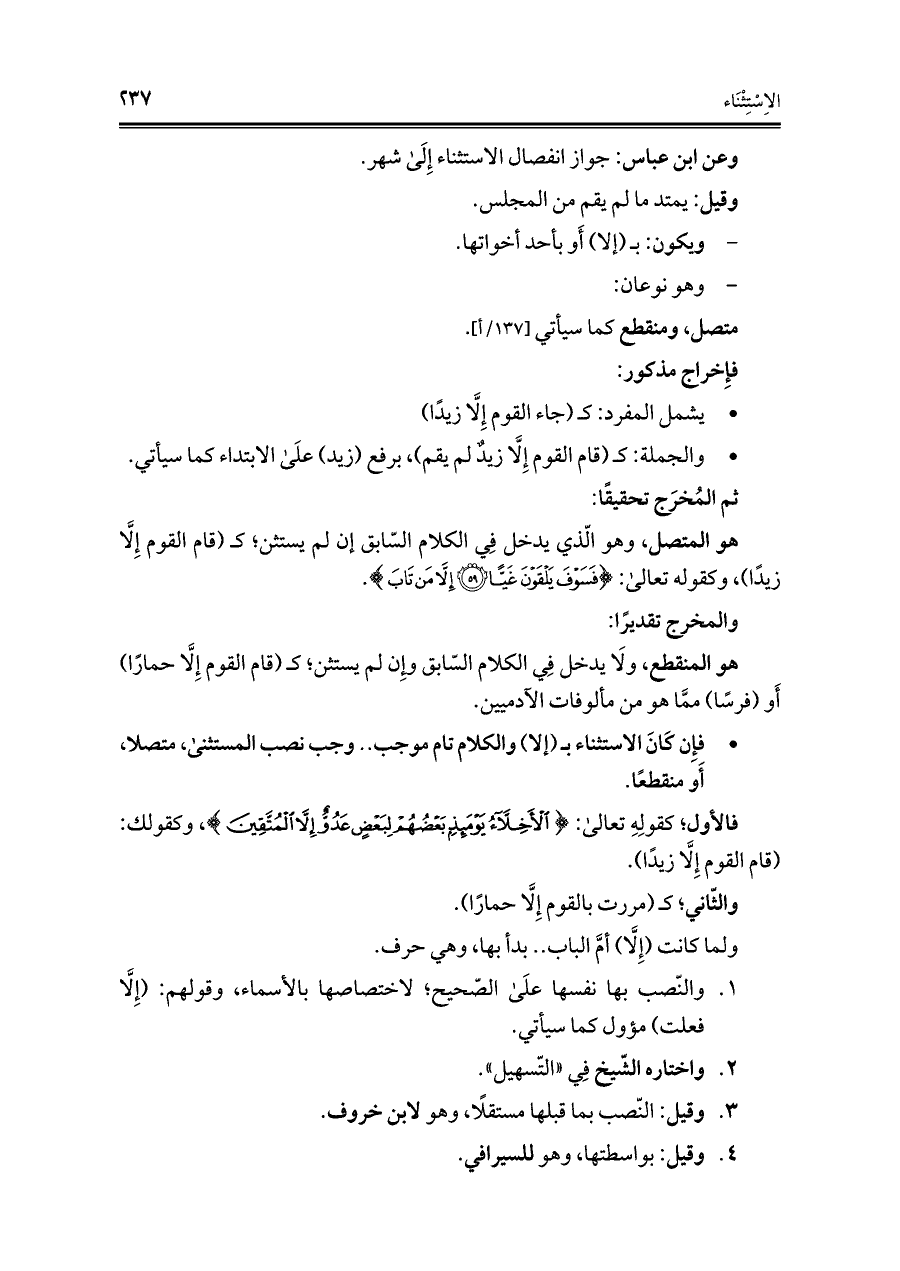 وعن ابن عباس: جواز انفصال الاستثناء إِلَى شهر.