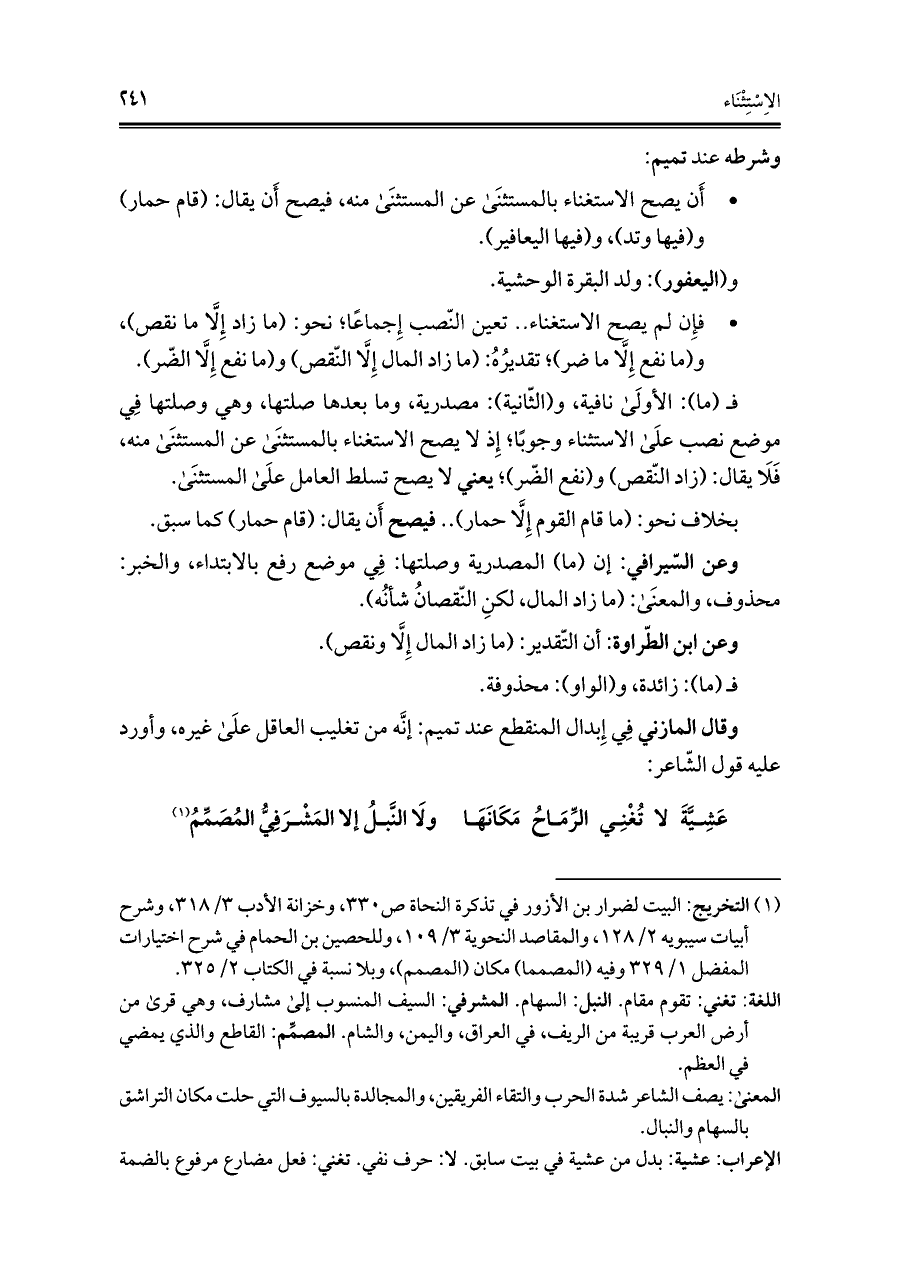 وقال المازني فِي إِبدال المنقطع عند تميم: إنَّه من تغليب العاقل علَى غيره، وأورد عليه قول الشّاعر:
