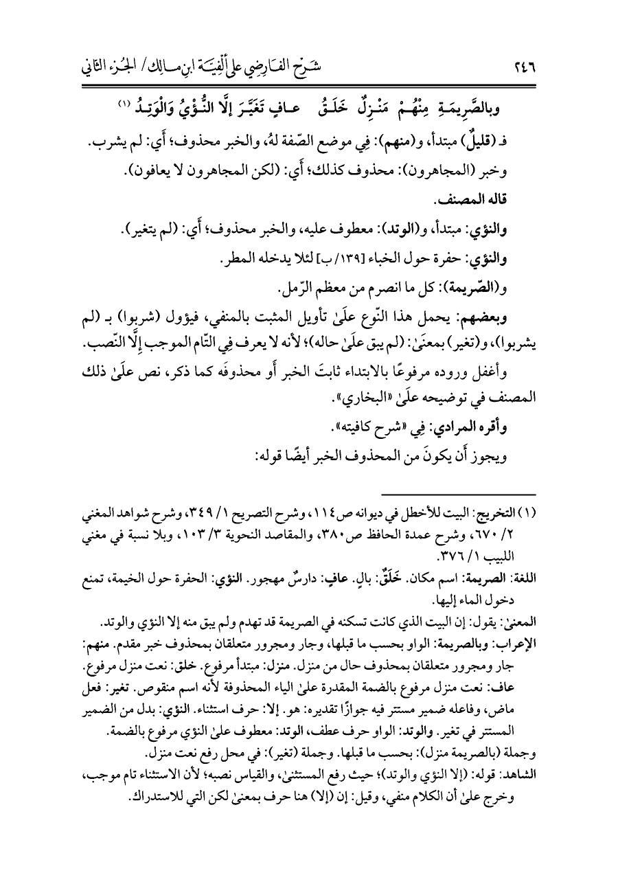 الإعراب: وبالصريمة: الواو بحسب ما قبلها، وجار ومجرور متعلقان بمحذوف خبر مقدم. منهم: جار ومجرور متعلقان بمحذوف حال من منزل. منزل: مبتدأ مرفوع. خلق: نعت منزل مرفوع. عاف: نعت منزل مرفوع بالضمة المقدرة على الياء المحذوفة لأنه اسم منقوص. تغير: فعل ماض، وفاعله ضمير مستتر فيه جوازًا تقديره: هو. إلا: حرف استثناء. النؤي: بدل من الضمير المستتر في تغير. والوتد: الواو حرف عطف، الوتد: معطوف على النؤي مرفوع بالضمة.